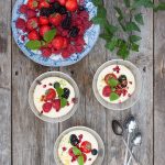 3. Skär arken i 12 fyrkanter. Pensla 4 ark med smör och lägg på varandra, lite slarvigt omlott. Placera en klick fyllning i mitten (ca 1 msk)  och vik upp kanterna av filodegen runtom för att skapa ett litet paket, öppen upptill. Ställ på en plåt med bakplåtspapper.