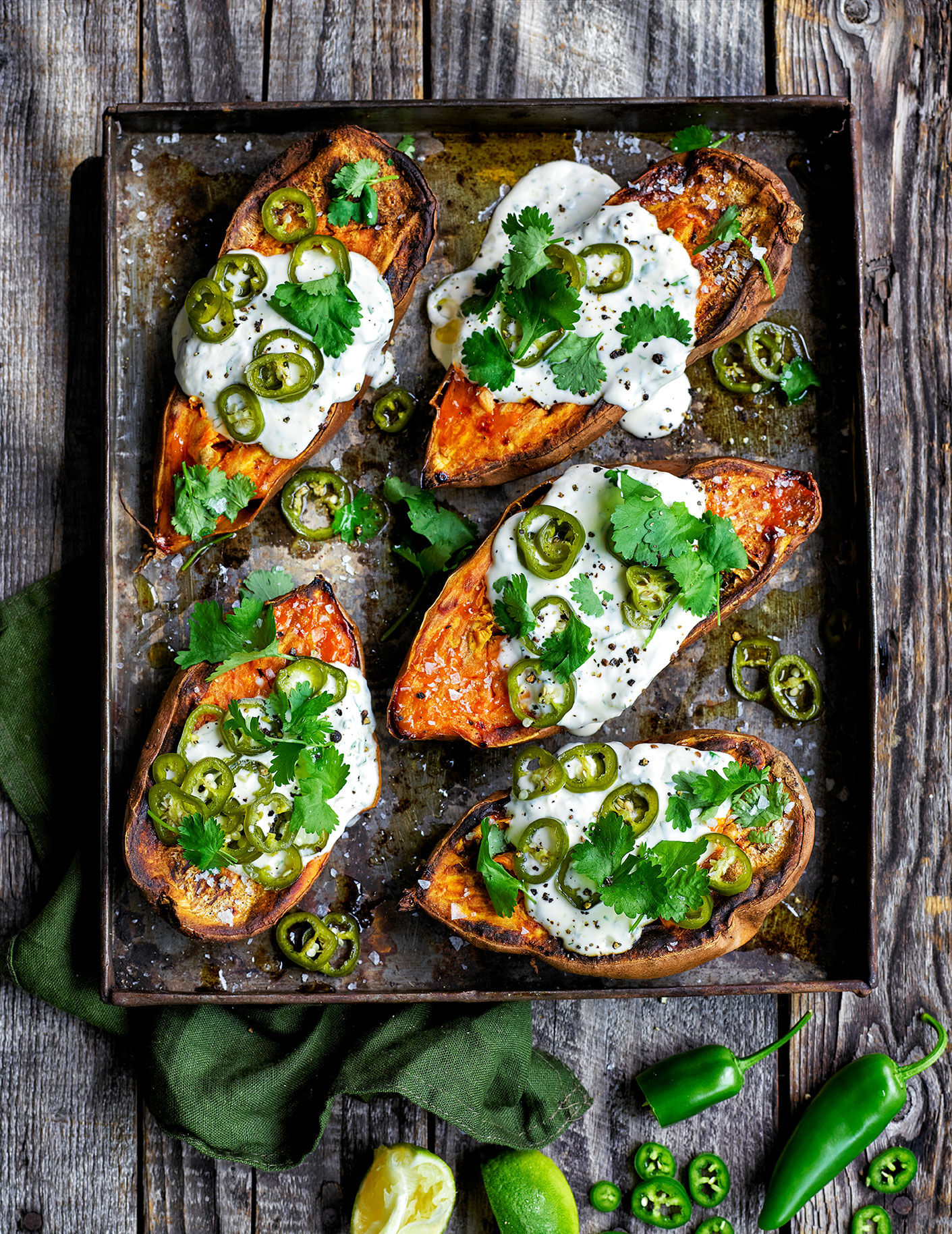 - Blanda crème fraîche, koriander, limeskal- och saft och salt. Klicka créme fraîche-röran på sötpotatisen och toppa med picklade jalapeños. Strö över nymalen svartpeppar och garnera med färsk koriander.