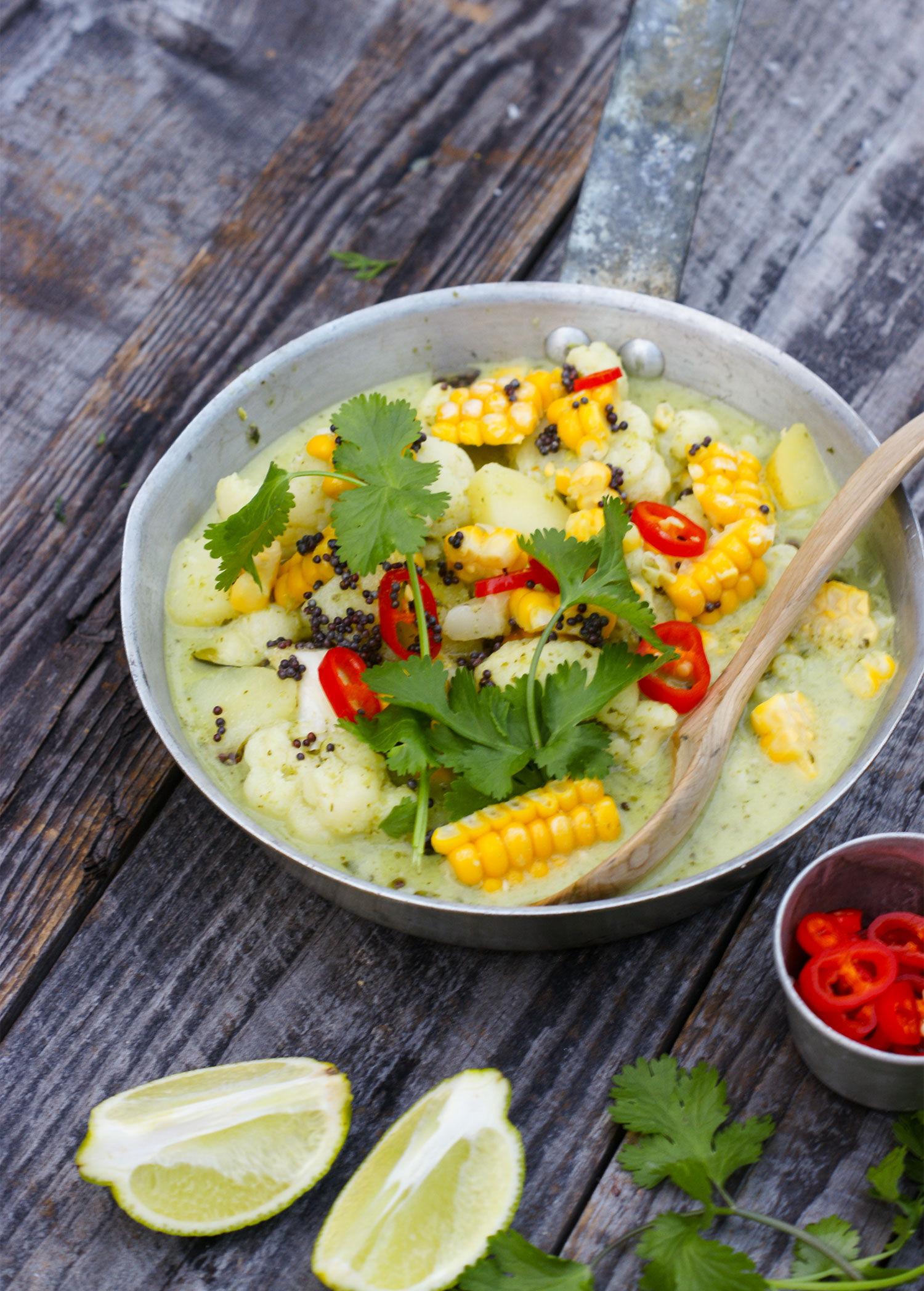 En liten annorlunda variant av den här goda grytan serverade vi första gången på vårt The Cookbook Café för många herrans år sedan. Inspiration fick vi från kokboken ”World Food Café – vegetarisk mat från hela världen”. Jag minns fortfarande hur fantastiskt god den var – den starka gröna chilin tillsammans med den söta majsen, kokosen och smörstekta senapsfröna. Här har vi gjort den lite matigare och tillsatt potatis och blomkål och dessutom lyft rätten till en ännu högre nivå genom att garnera med en söt, stark och syrlig picklad chili. En riktigt smakupplevelse!