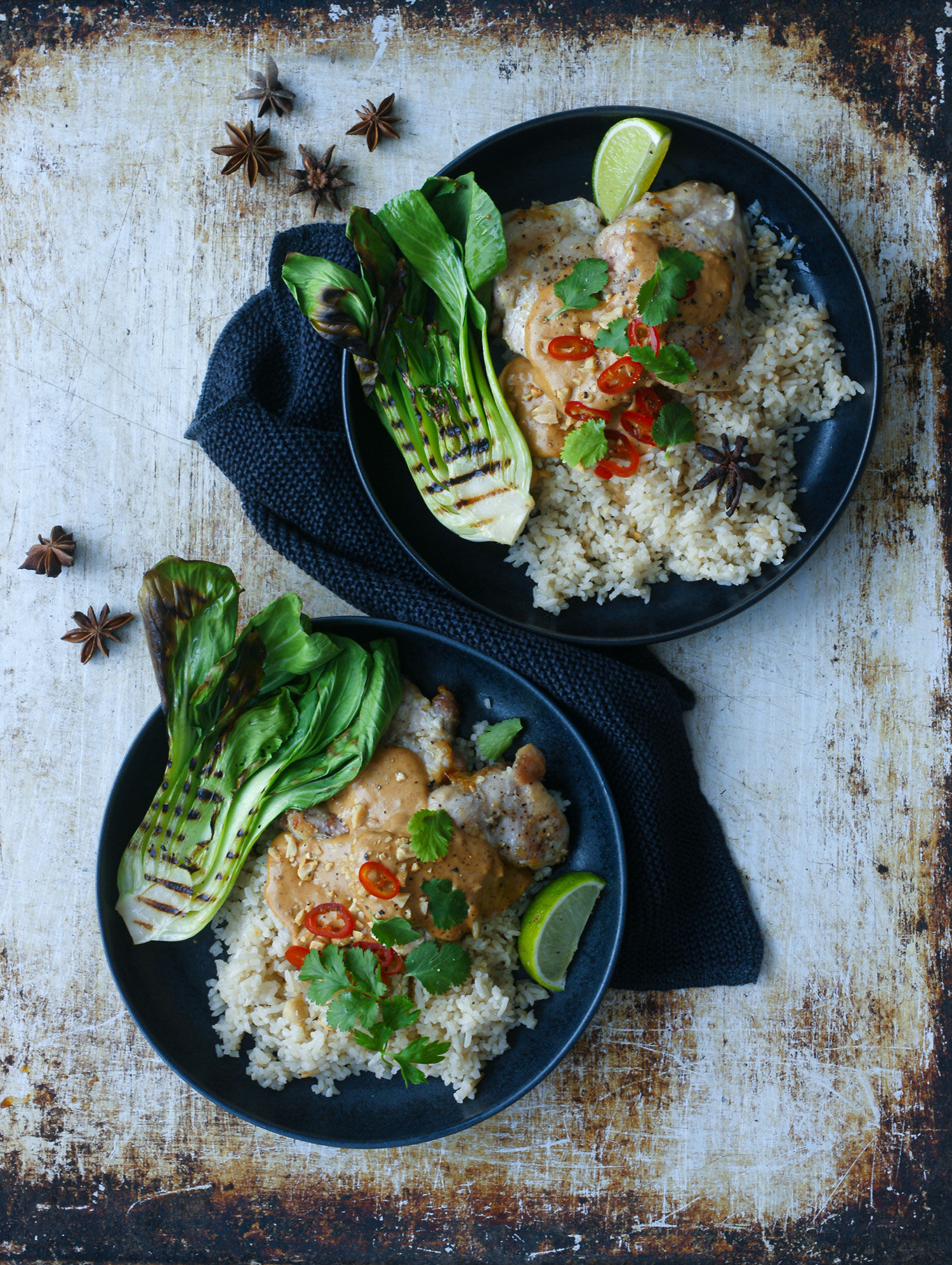 - Servera kycklingen med riset, boy choy och jordnötssåsen. Garnera med hackade jordnötter, koriander, skivad chili och limeklyftor