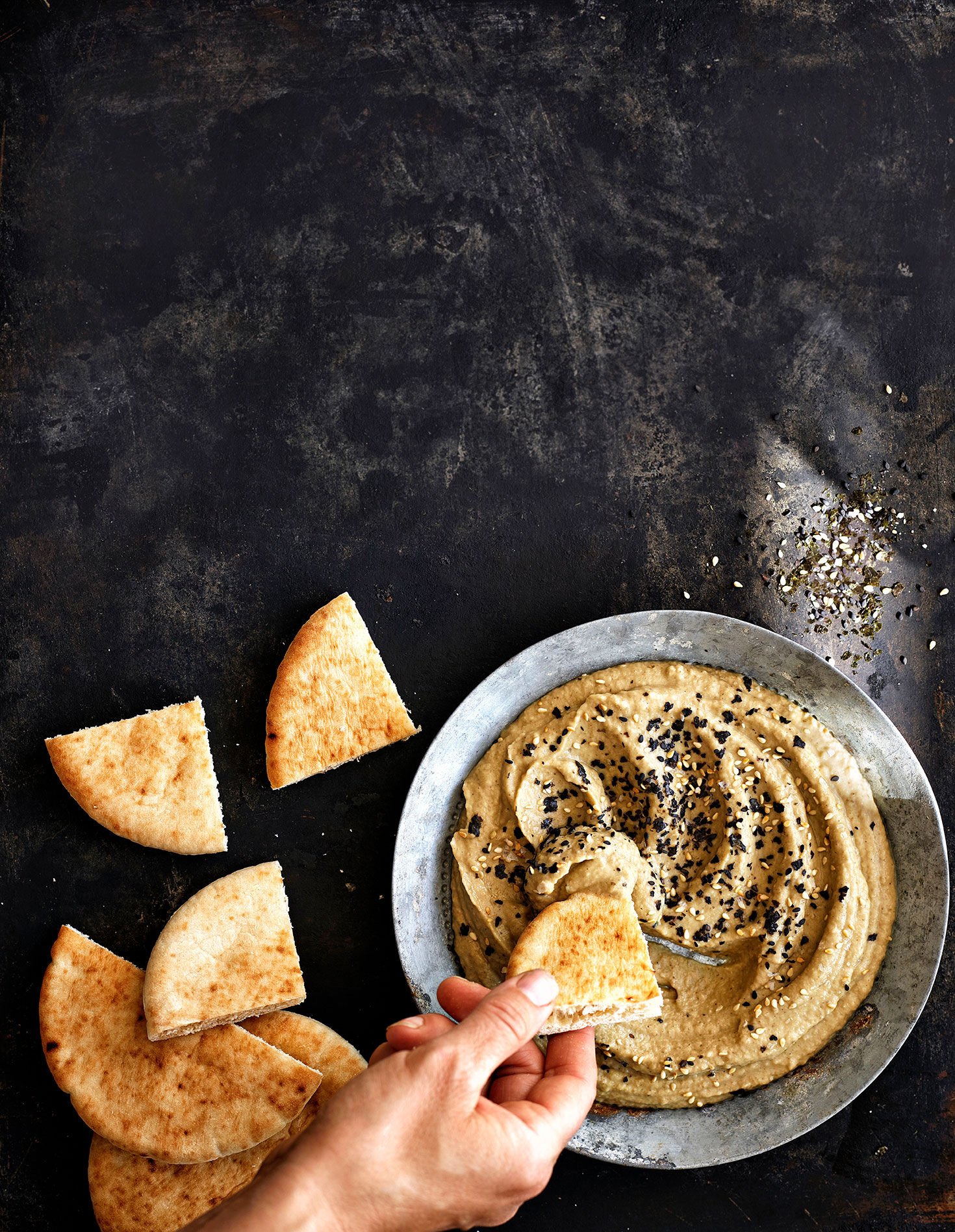 6. Lägg i en matberedare tillsammans med resten av ingredienserna och mixa till en slät kräm. Lägg upp i en skål och garnera med furikake. Servera med t ex pitabröd.