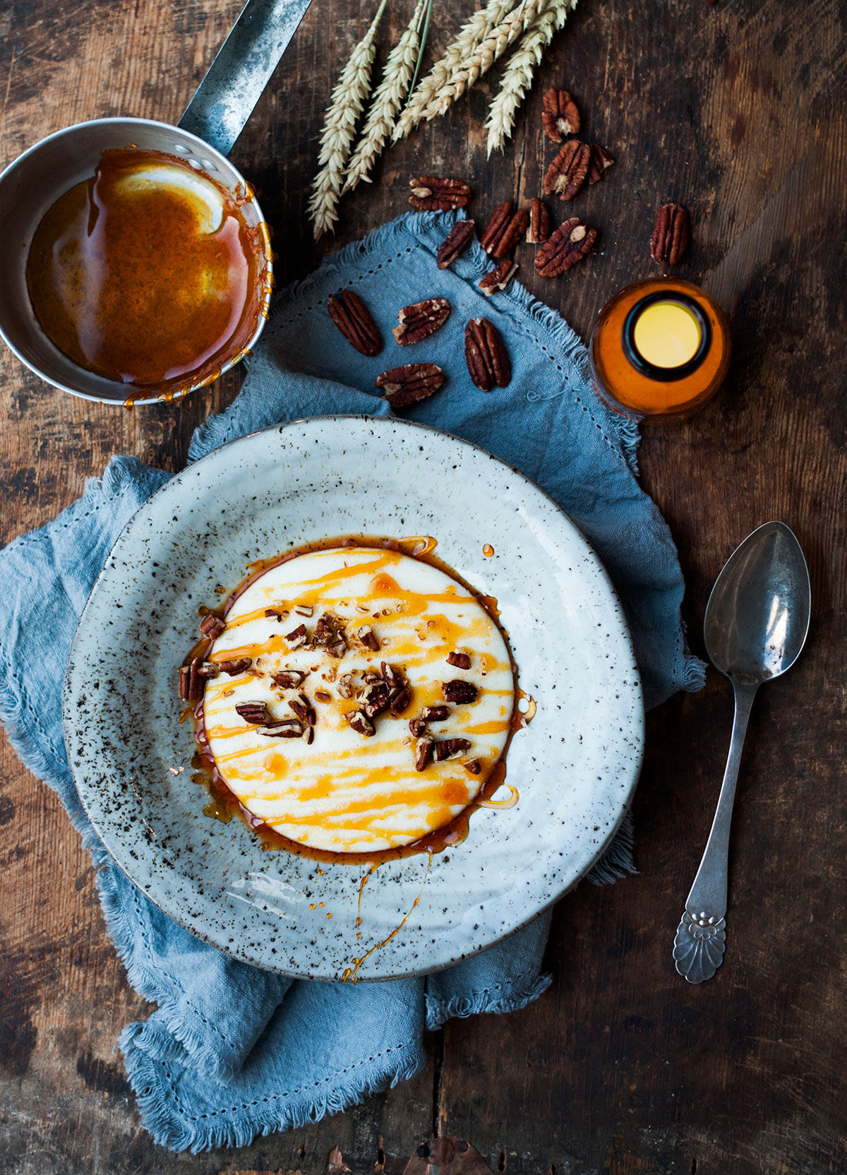 När vi var små åt vi ofta mannagrynsgröt med farinsocker och solöga – dvs en klick smör i mitten. Så gott. Och egentligen så onyttigt för barn att äta till frukost. Nåväl. Här jag vi möjligtvis gjort en ännu godare – och ännu onyttigare variant…