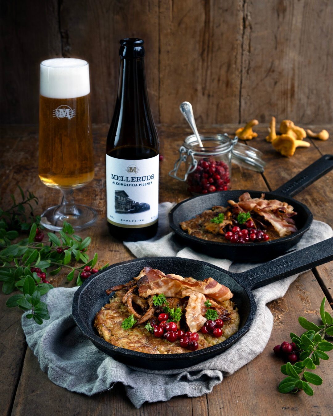 Med tanke på att man slog tappen ur första öltunnan för första gången 1904 på Melleruds bryggeri, så tycker vi att det känns självklart att servera Melleruds Alkoholfria Pilsner till husmanskost! Och just då passar råraka perfekt! Pilsnerns fylliga smak, finstämda doft av malt och delikata beska gifter sig utomordentligt med sältan i bacon, det sötsyrliga i lingon samt de lätt jordiga tonerna i kantareller. En klassisk rätt och en klassisk pilsner – som med sina svenska smaker ger en komplett kulinarisk upplevelse!