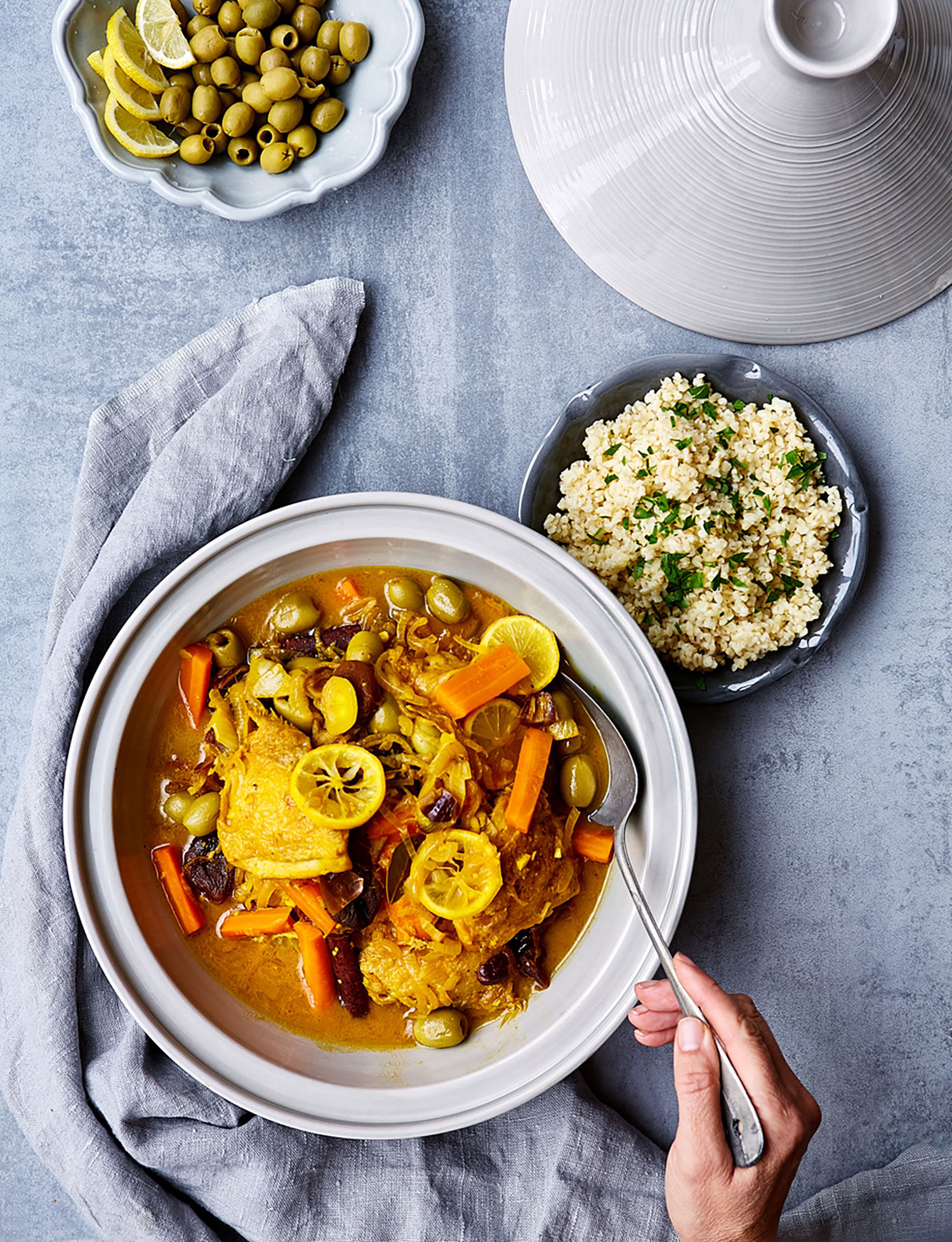 En mustig och värmande kycklingtagine med saffran, aprikoser och oliver. Bli inte avskräckt av den långa ingredienslistan. Scrollar du ner till instruktionerna så ser du hur otroligt enkelt och snabbt det går att göra denna makalös goda tagine. Tagine är för övrigt en nordafrikanskt maträtt – som lagas i en kärl med konformad lock som kallas just tagine (som den på bilden). Det går förstås bra att laga i en vanlig kastrull eller grytjärn också.