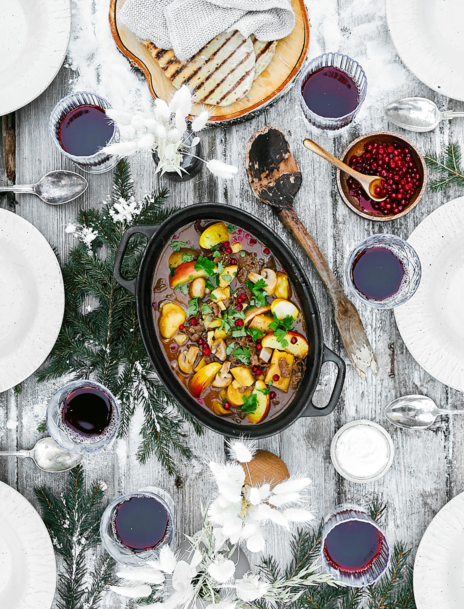 - Smaka av med salt och peppar. Rör ner äppelklyftor, svamp och lingon. Garnera grytan med persilja. Servera med Västerbottensostkräm.