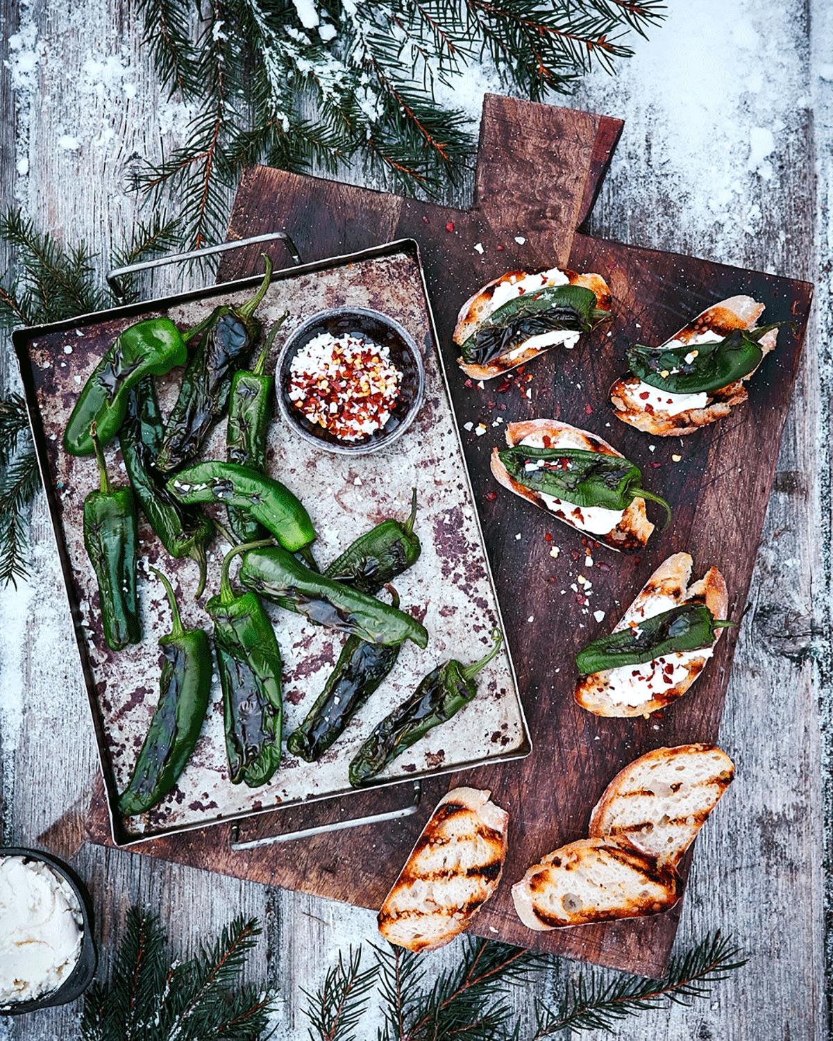 Pimientos de padrón är en mildare chili. Den är populär att äta som snacks – grillade med lite flingsalt. Här serverar vi dem på rostade baguetteskivor med färskost.