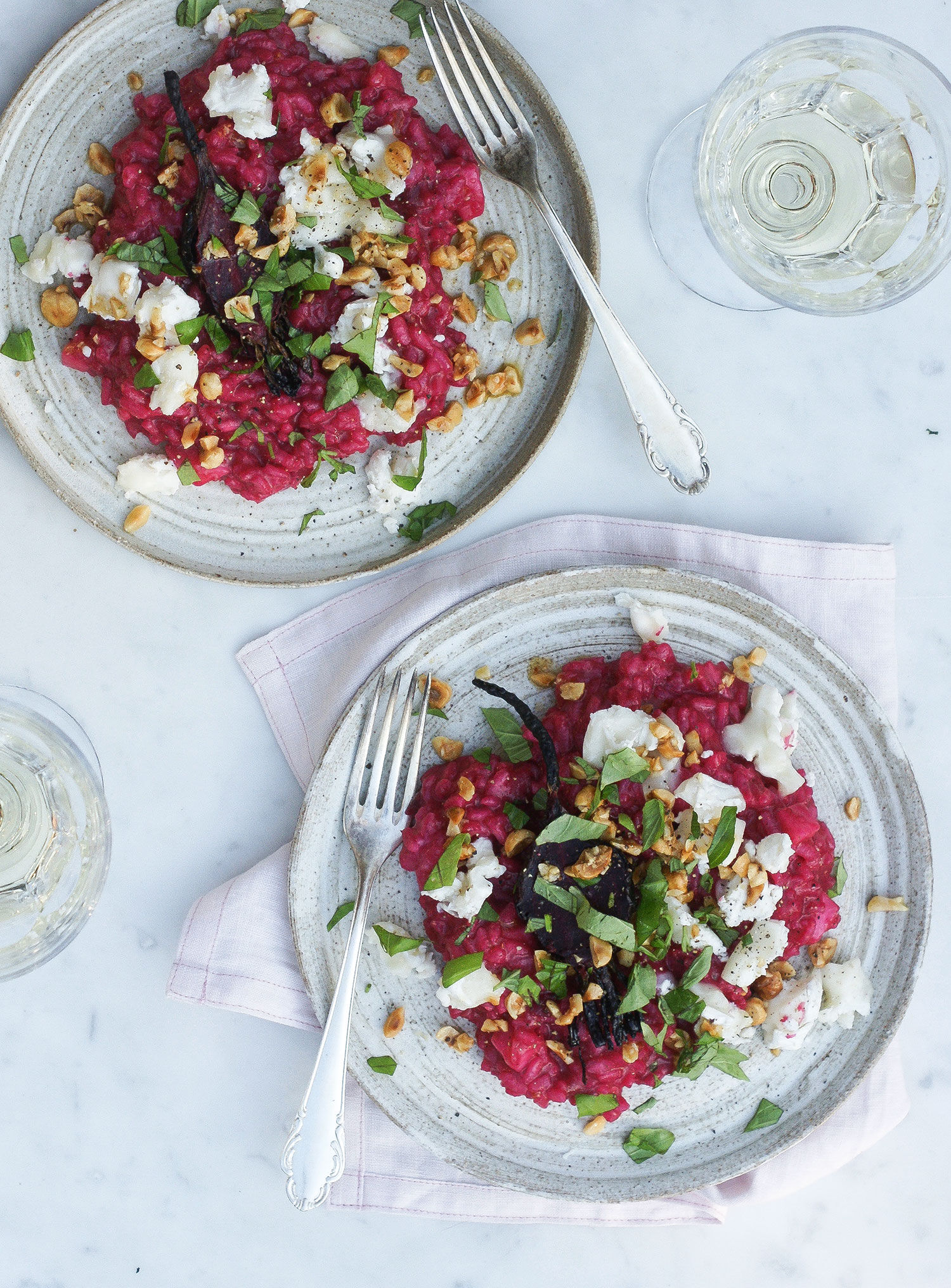 Rödbets­risotto med äpple, chèvre, hasselnötter och brynt smör