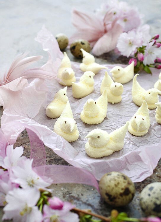 Små söta och smarriga marshmallow-kycklingar. Det krävs lite övning för att få till näbb och stjärt – men även fula små kycklingar är goda.