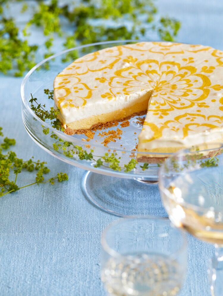 Fryst mangocheesecake! Förutom att den är vansinnigt god så är den otroligt vacker också med sitt snirkliga mönster – som är lättare än vad man tror att göra. Fördelen med en fryst cheesecake är att man kan göra den relativt långt i förväg, då den ska ändå förvaras i frysen. Men bäst av allt (förutom smaken förstås) är att det behövs så få ingredienser. Kan ju inte bli bättre!Foto Helen Pe