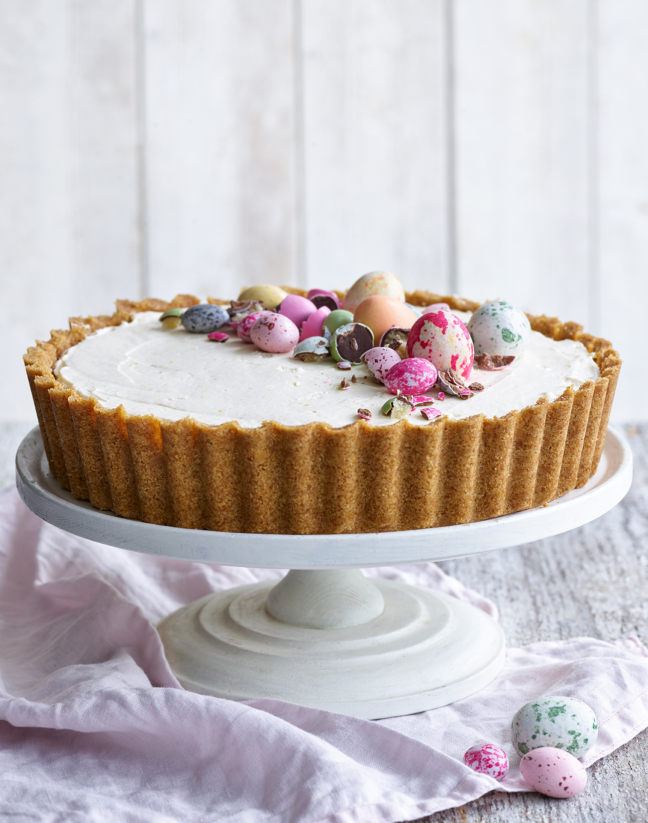 5. Vid servering, försiktigt lossa på kakan med en kniv och lägg upp på ett tårtfat. Dekorera med chokladägg, några krossade och några hela. Servera direkt.