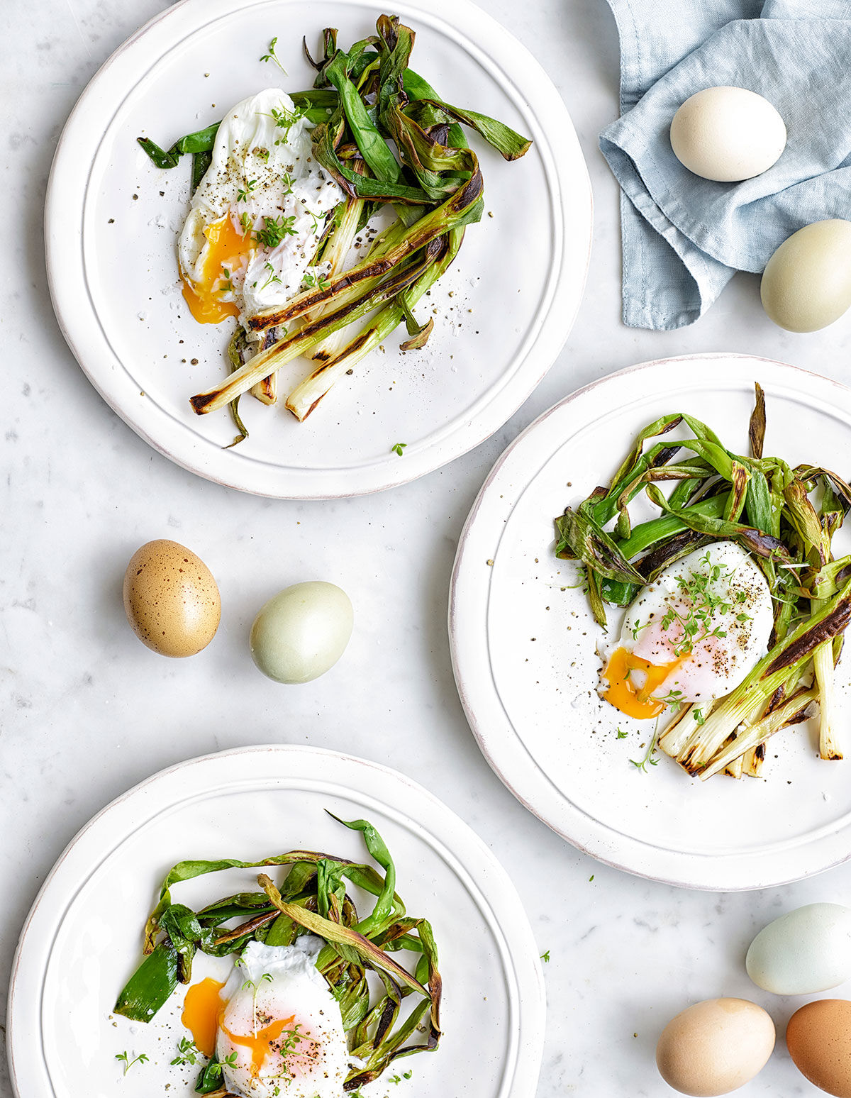 Det är sällan man äter salladslök som en egen rätt – vilket är synd då den är väldig god. Vilket du kommer upptäcka här – när vi serverar den med ett härligt krämigt pocherat ägg. För övrigt kan vi upplysa om att det heter just ”salladslök” och inte ”vårlök”. På grund av misstolkning av det engelska namnet ”spring onion” händer det att många säger salladslök – men det är som sagt fel (även om vårlök kanske låter trevligare…).Foto: Helen Pe