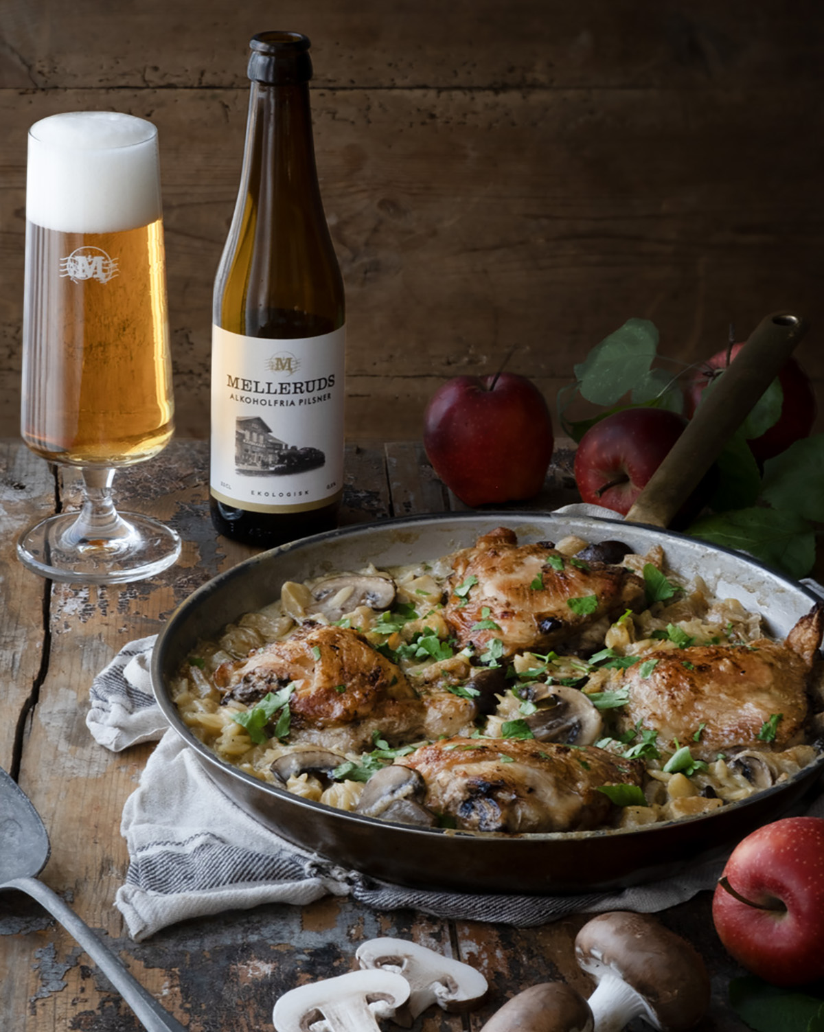 Även om mörkret är på väg bort så dröjer sig kylan kvar. Vi tänder en brasa och njuter av värmande och goda middagar i sällskap av familj och vänner. Och just när det är kyligt och kallt så lägger vi ner lite extra tid och kärlek i det vi lagar – och dricker. Då parar vi gärna ihop maten med en passande dryck. T ex till denna krämiga risoni med kyckling, äpple och svamp passar det utmärkt med en Melleruds Alkoholfri Pilsner. Dess fylliga smak och delikata beska förhöjer de höstiga tonerna i maten. En fulländad måltid helt enkelt. I SAMARBETE MED MELLERUDS ALKOHOLFRIA PILSNER