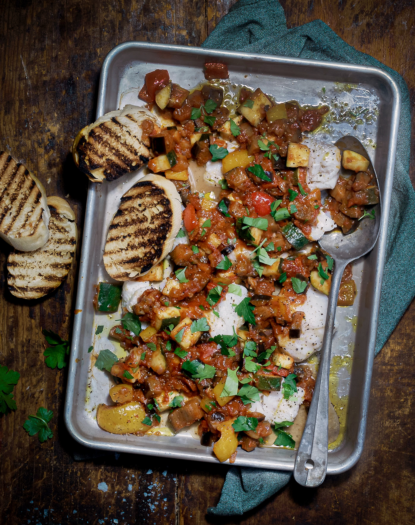- Fördela ratatouillen över torsken och garnera med kryddgrönt.