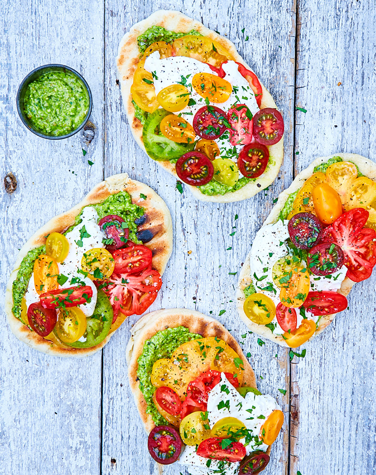 Nu är värmen äntligen här (iallafall i Stockholm). Så nu blir det grillpremiär. Vad sägs om dessa grillade flatbread med burrata, tomat och svensk pesto. Brödet kan tillagas direkt på gallret på grillen alternativt i en stek- eller grillpanna.