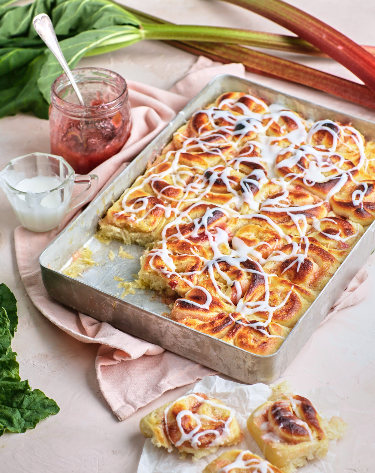 Dessa sötsyrliga bullar är lite härligt kletiga med både rabarberfyllning och glasyr. Vill du enkelt göra egen rabarbersylt hittar du receptet här!Foto: Lisa Björner