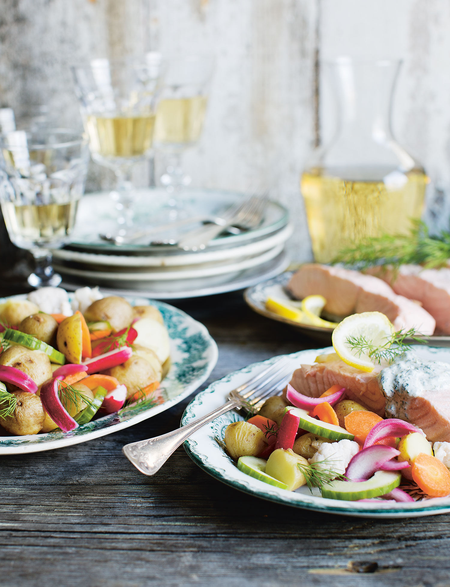 När vi flyttade till Sverige, bjöd vår mormor på den här inkokta laxen till vår välkomstmiddag. Året var 1982, det var en ljus och varm sommarkväll och vi satt på den inglasade verandan som doftade pelargoner, i hennes sommarstuga i Nor utanför Järvsö. Det som gör en måltid minnesvärd är ofta en kombination av maten, miljön, sällskapet och händelserna runt omkring den. Den här rätten lagar vi ofta och har även blivit våra barns favorit.Receptet kommer från vår bok Till bords med systrarna Eisenman
