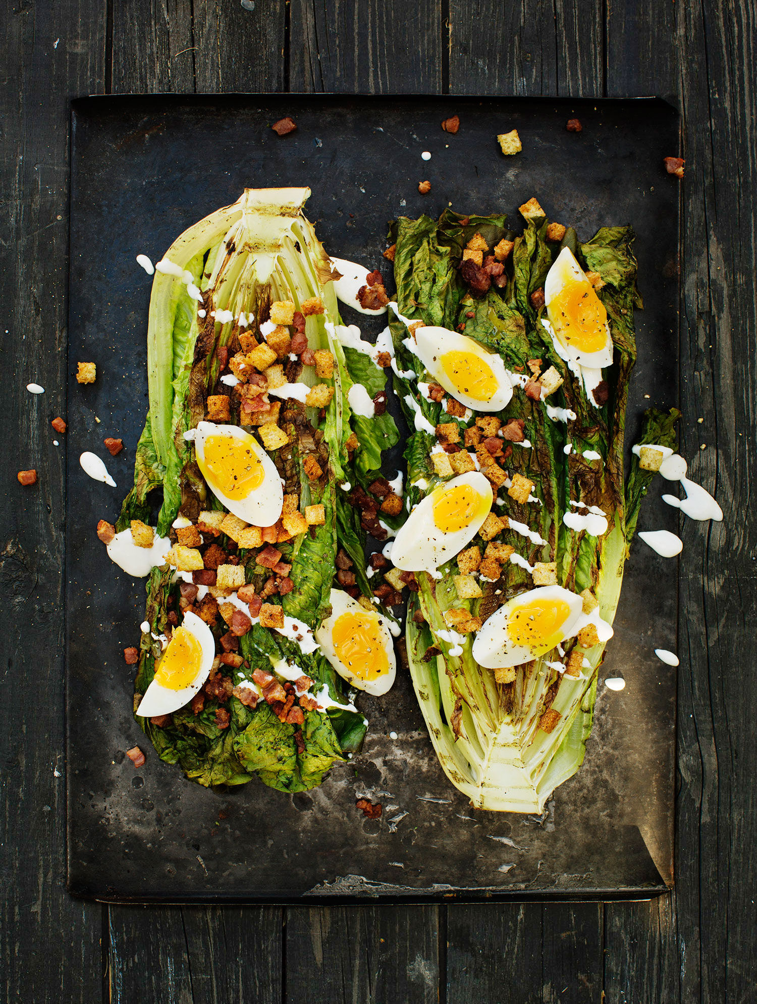 En annorlunda variant på den klassiska Caesarsalladen där romansalladen grillas och serveras med pancetta, örtkrutonger, ägg och Caesardressing.