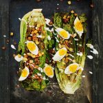 Grillad roman­sallad med pancetta, ört­krutonger, ägg och Caesar­dressing