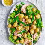 Varmrökt lax med potatis & vinaigrette på syltad ingefära & saltinlagd citron