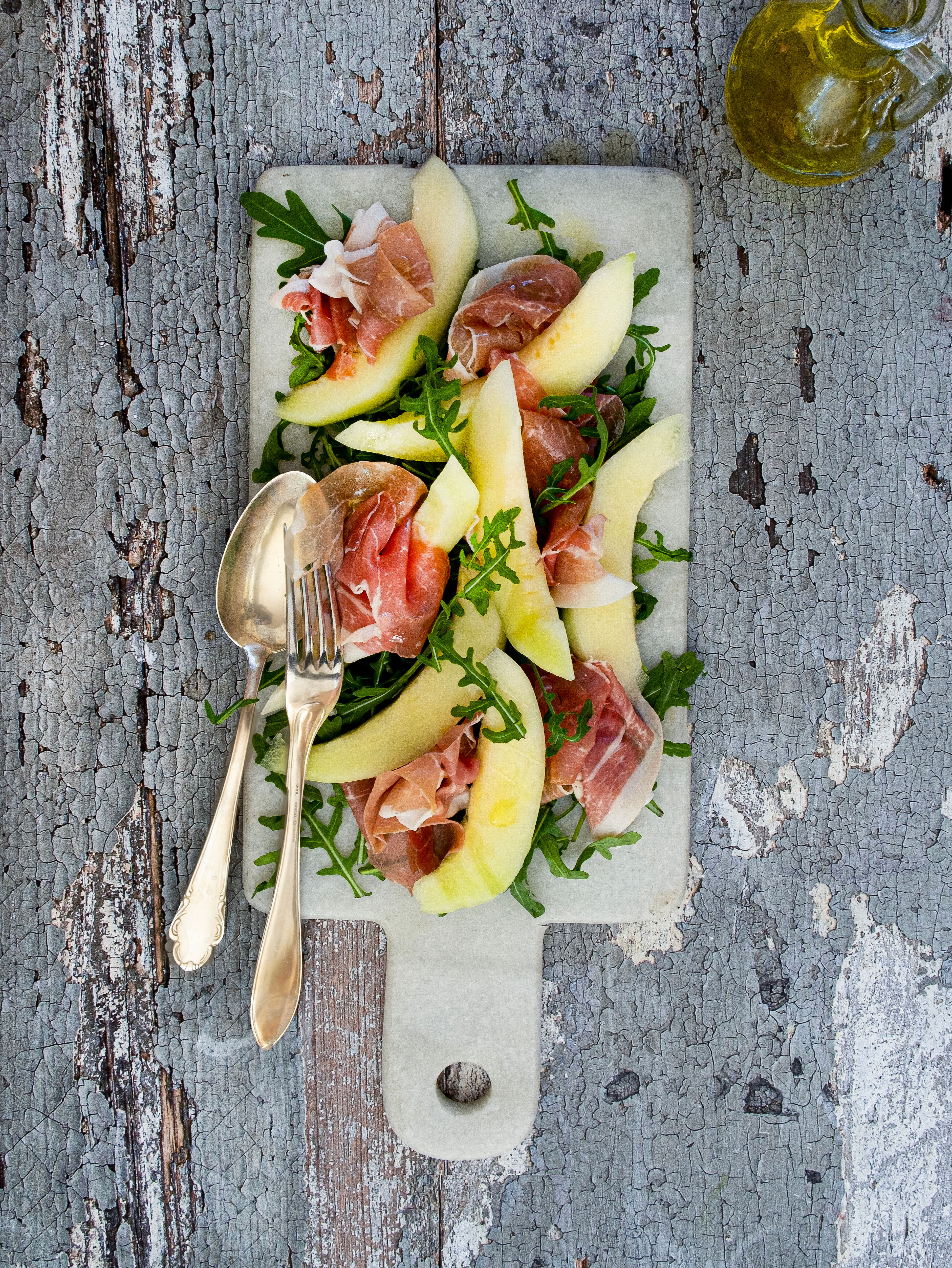 - Skala, kärna ur och skär melonen i klyftor. Lägg upp på ett fat tillsammans med prosciutto och rucola. Ringla över lite olivolja. Servera med gott bröd, gärna focaccia.