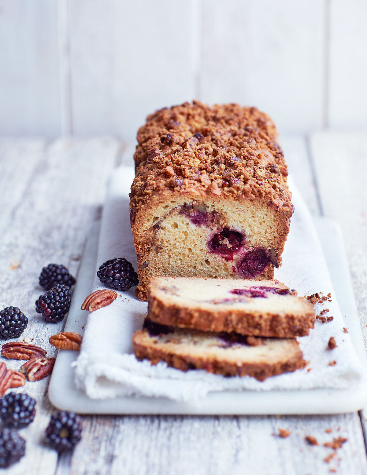 4. Häll hälften av smeten i formen. Strö över björnbären och hälften av strösslet. Klicka ut resten av smeten och strö över resten av strösslet.