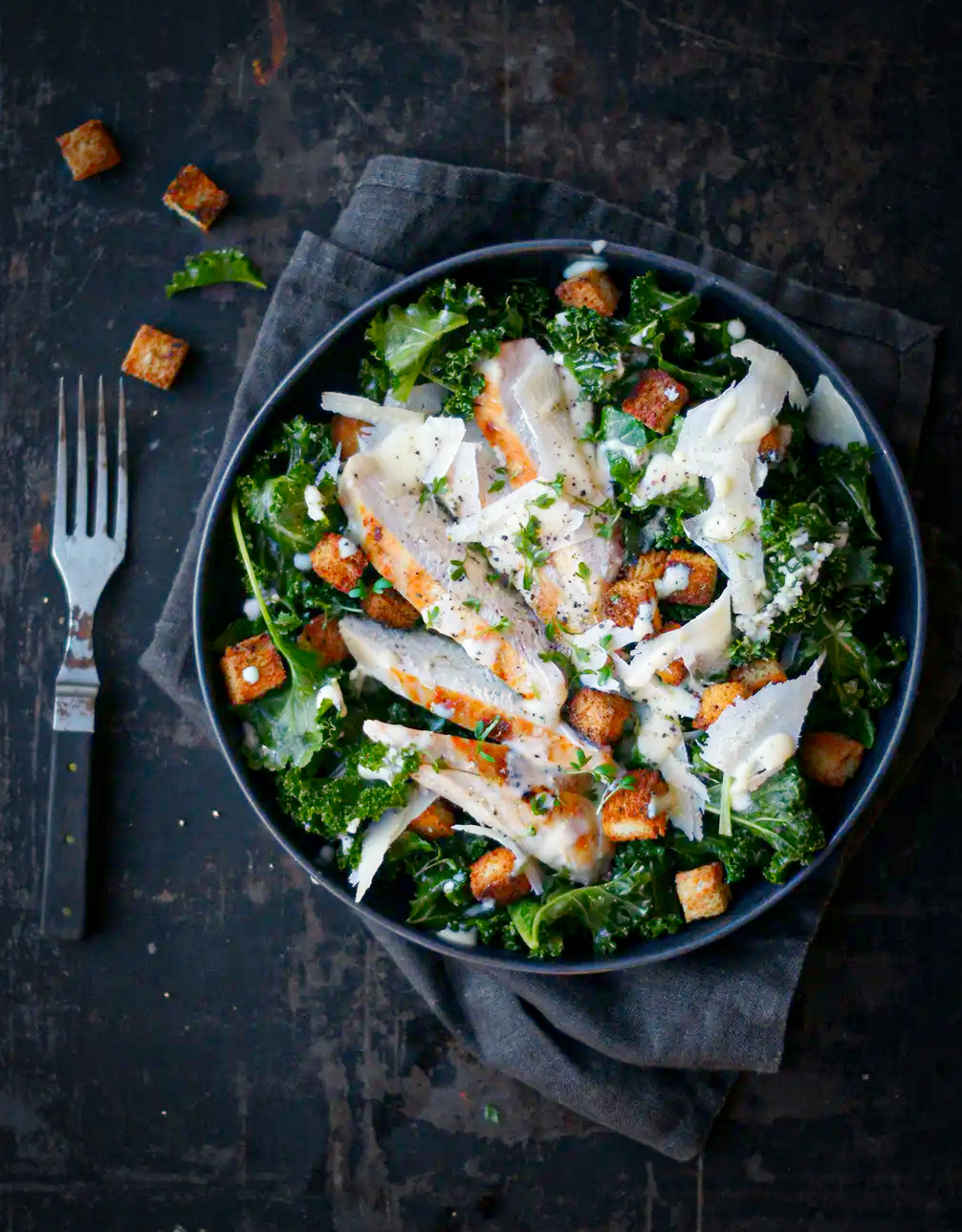 - Blanda grönkål och krutonger. Skiva kycklingen och lägg på grönkålen. Ringla över lite av dressingen och servera resten vid sidan om. Garnera med hyvlad parmesan.