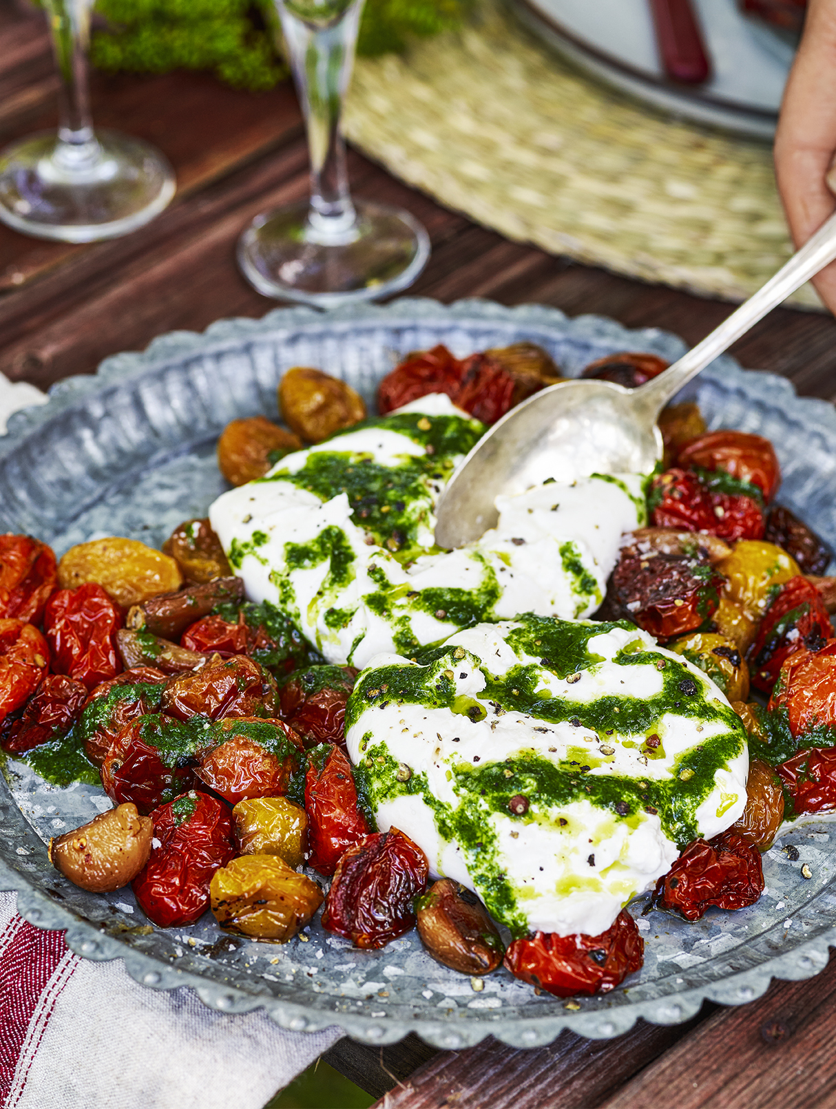 Burrata är en lite lyxigare och krämigare variant av mozzarella. Egentligen serveras den i all sin enkelhet men lite olivolja och crostinis. Här har vi dock valt att servera den med ugnsrostade tomater som blir riktigt söta och goda pga den långa tiden i ugnen samt basilikaolja.Foto: Helen Pe