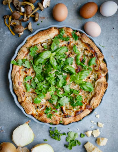 En matig paj är så himla gott – och tänk vad oändligt många olika fyllningar man kan smaksätta den med! Det har regnat här i Stockholm så förhoppningsvis kan vi hitta lite svamp. Först måste vi dock tömma frysen på förra årets svampskörd – och då får det bli denna smarriga lök- och svamppaj med parmesanost. Vi använder färdig smördeg här så går pajen snabbt att göra och dessutom blir den härligt frasig och god!