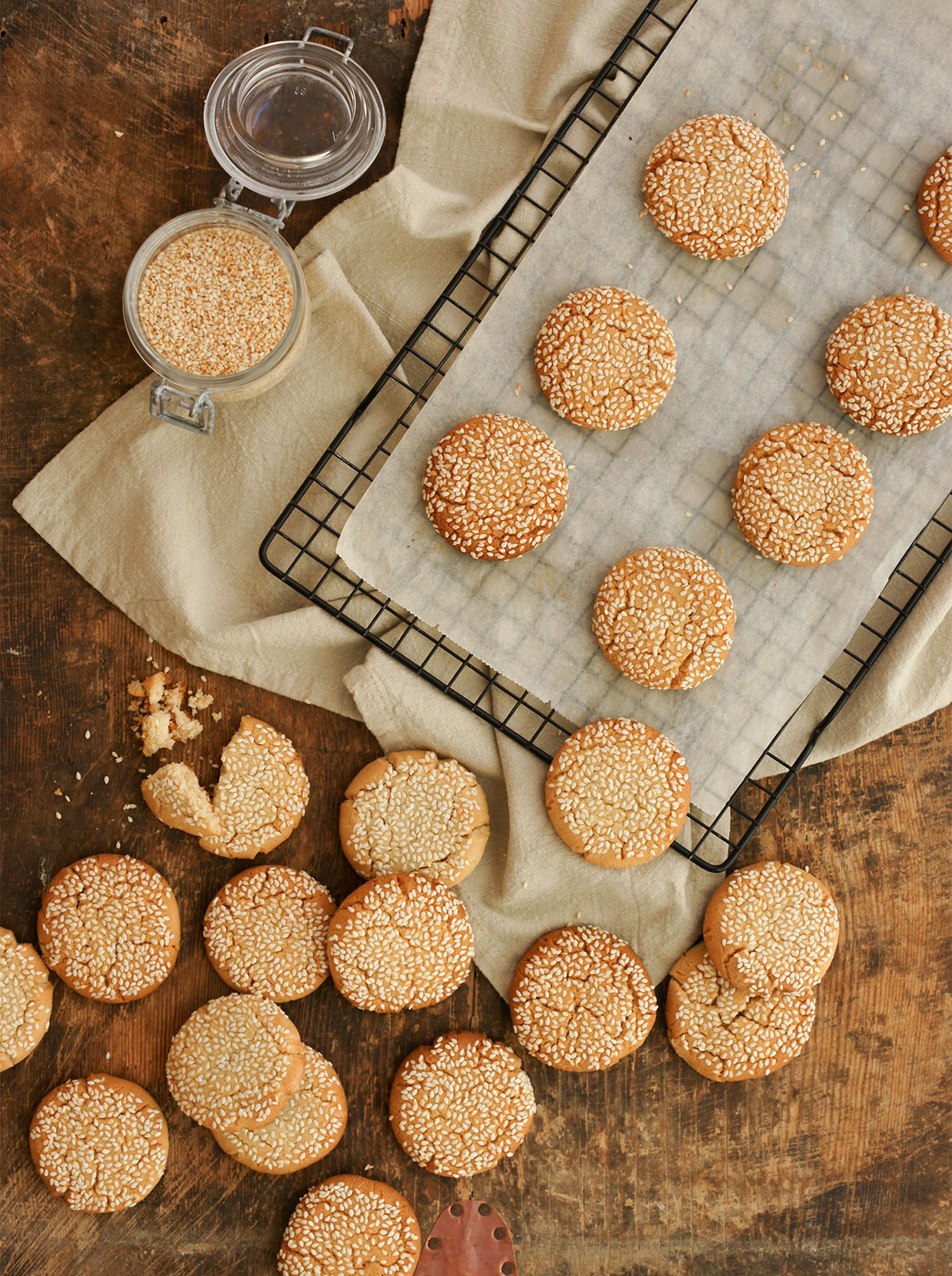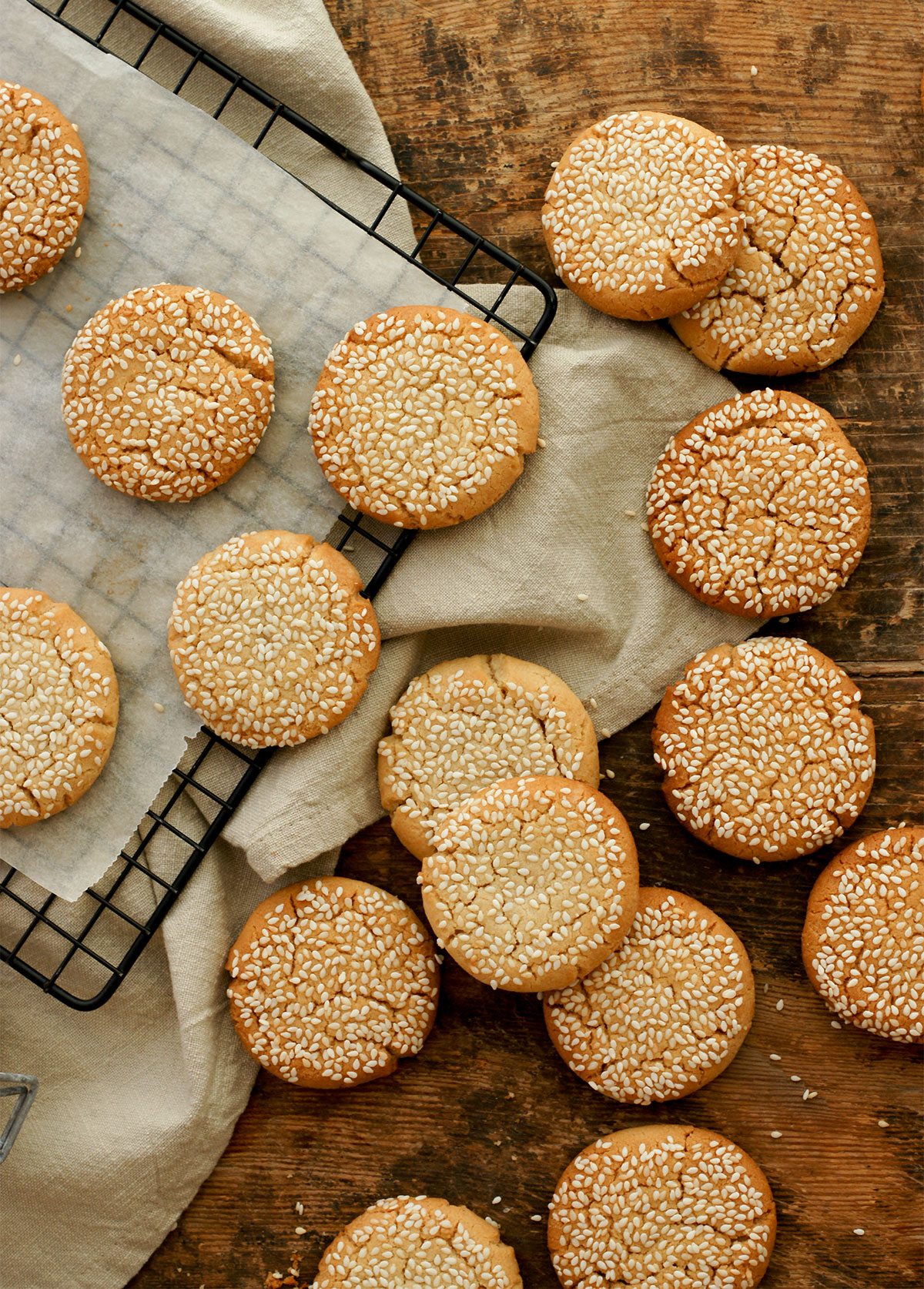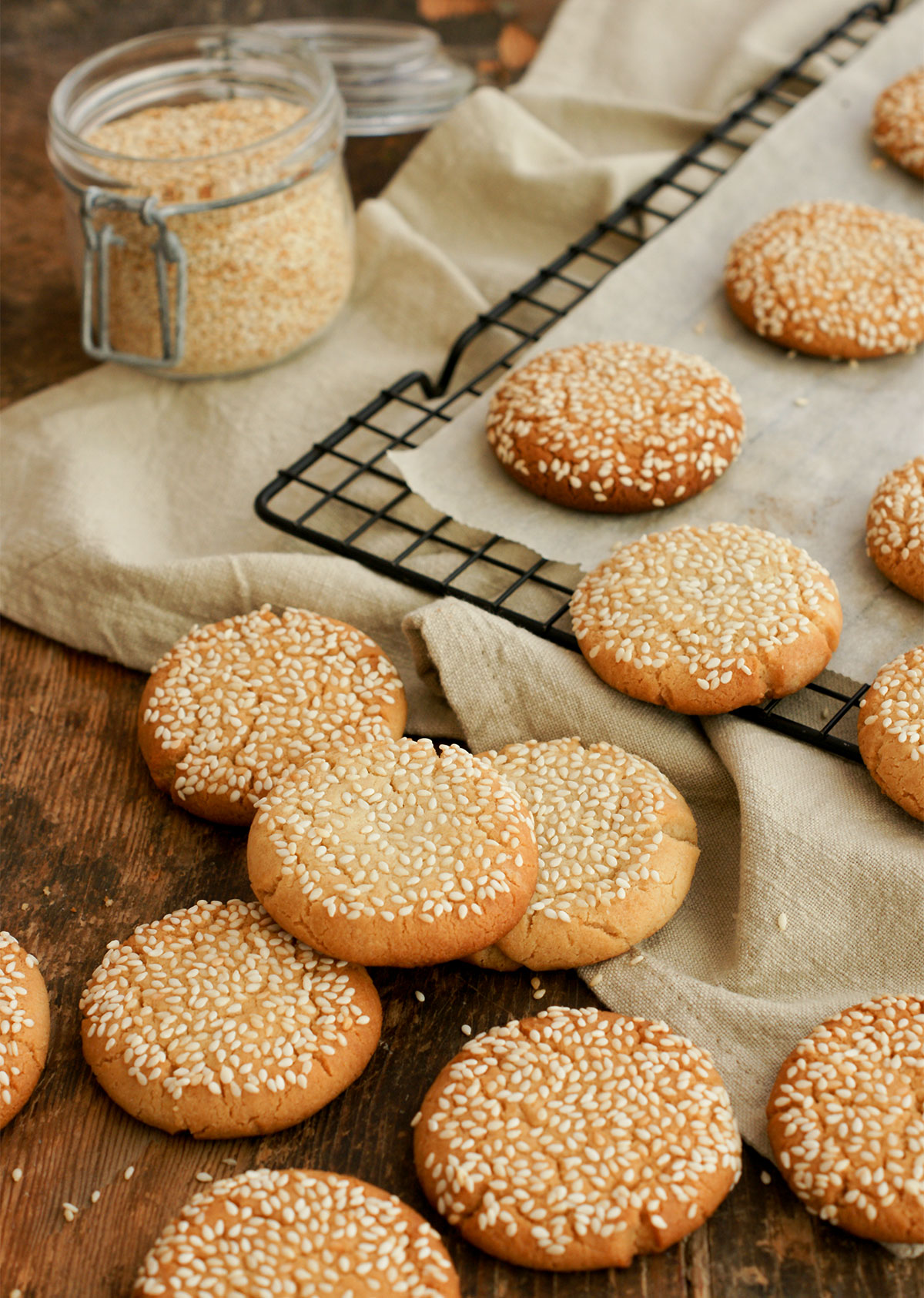 - Häll ut sesamfröna på en tallrik. Rulla degen till små bollar. Lägg en degboll på tallriken med sesamfrön, tryck till degen så den plattas till något och botten täcks med sesamfrön. Lägg kakan (med sidan med sesamfrön uppåt) på en plåt täckt med bakplåtspapper. Gör likadant med resterande deg.