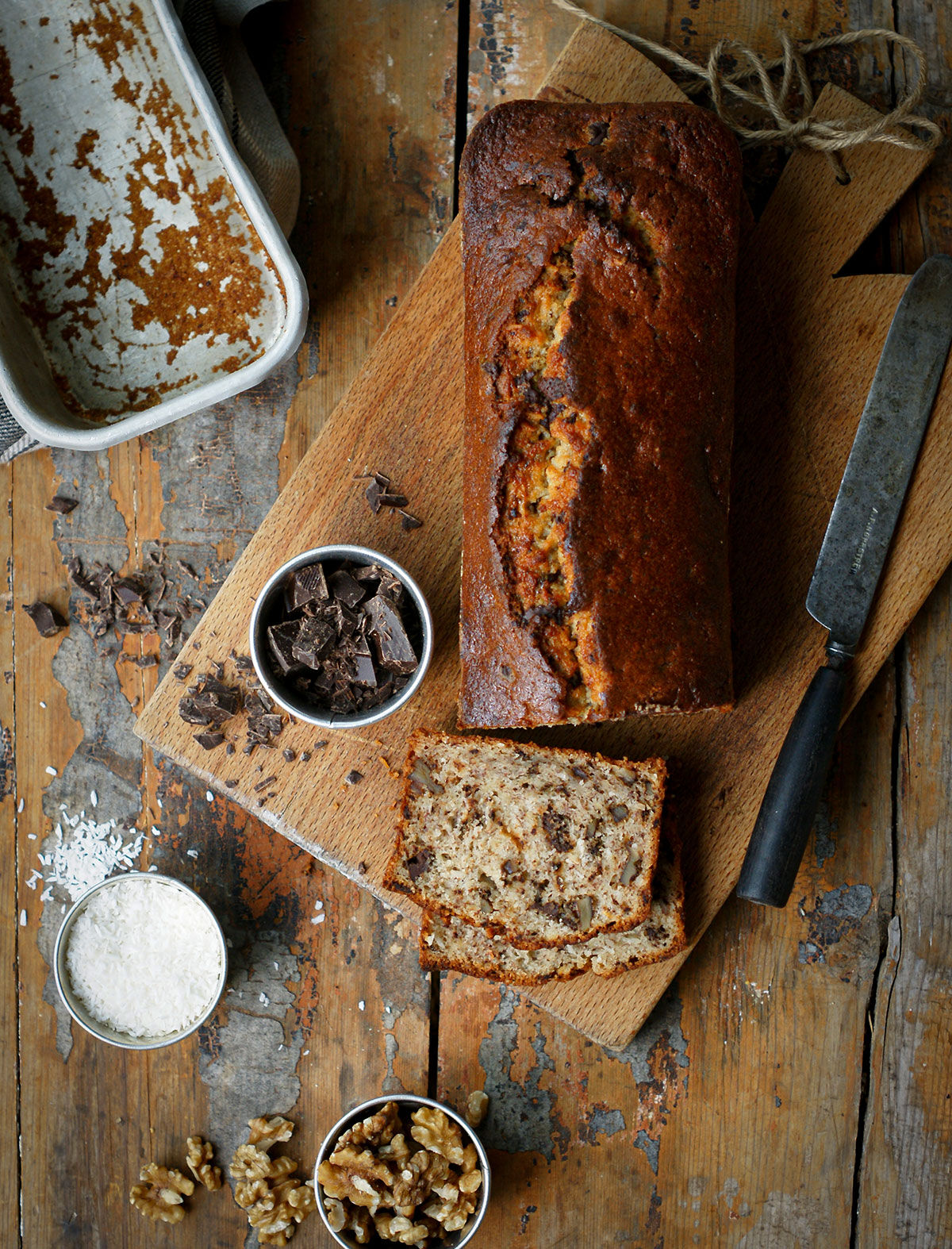 I butiken där jag brukar handla har de alltid en korg med grönsaker och frukt till billig pris som börjar bli lite dåliga. Jag som älskar mogna bananer fyndar där varje dag. De flesta av bananerna åker ner i morgon-smoothien men ibland hamnar de även i en banankaka. Vi har många recept på olika varianter av banankaka här på bloggen – men favoriten är nog denna med choklad, kokos och valnötter.
