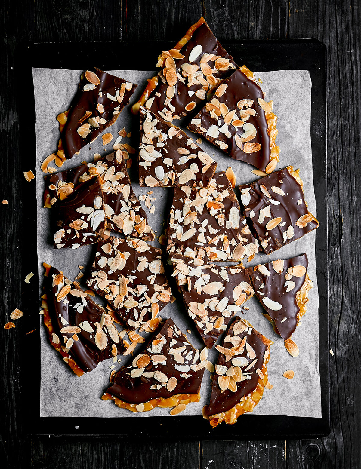 3. Smält blockchokladen i en skål över sjudande vattenbad och bred ut över mandelknäcken. Strö över de rostade mandelspånen. Låt kallna och bryt sedan i bitar.