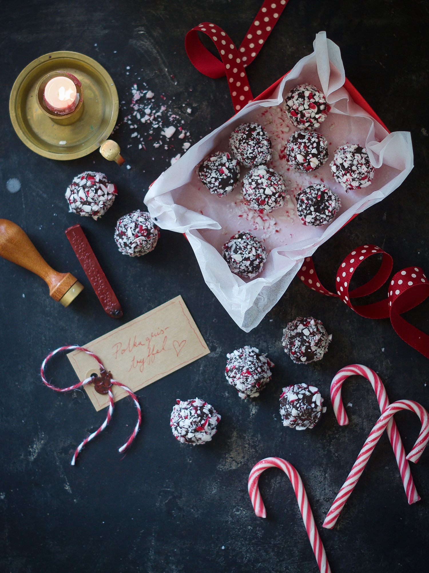 För oss har polkagrisar alltid varit förknippad med julen. Kanske för att polkagriskäppar är ett typiskt amerikanskt julgodis, som man även gärna hänger upp i julgranen. Därför så har vi ofta den i våra julbakverk och godis – som t ex denna polkagristryffel. Choklad och mint är nämligen en alldeles ypperliga smakkombination.