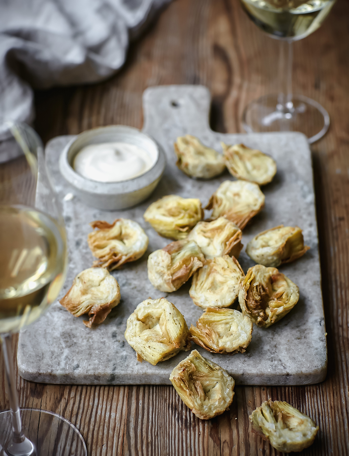 De lite syrliga kronärtkockshjärtan passar perfekt att doppa i den salta misodippen. Extra goda blir de också genom att friteras lite krispiga.Foto: Lisa Björner