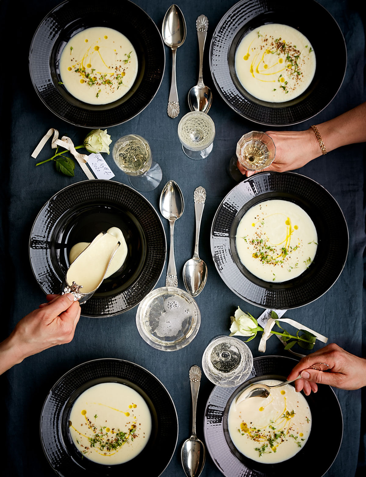 En riktigt läcker och krämig jordärtskockssoppa med Pernod, toppad med rostad anis och svartpeppar.