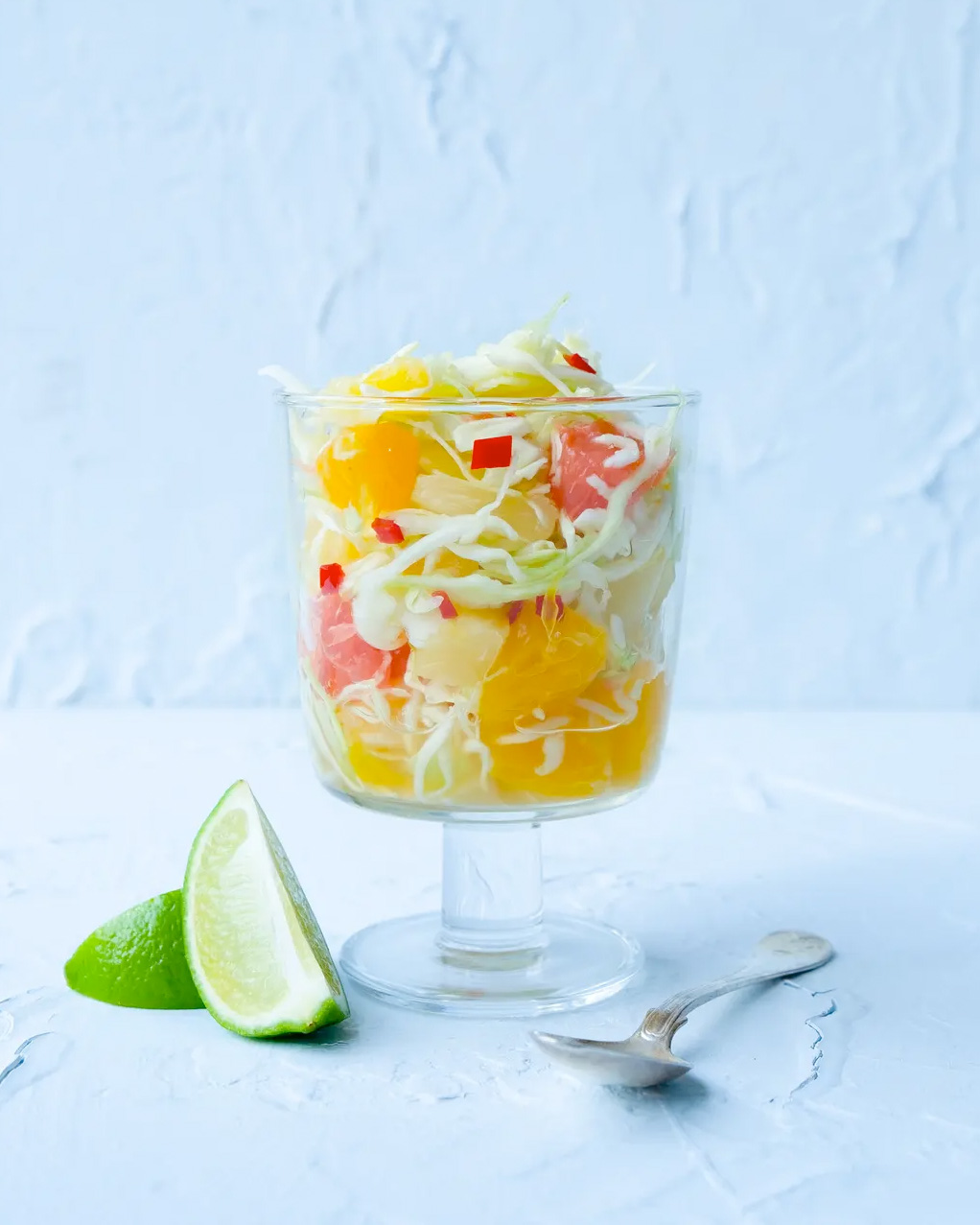 Vi fullkomligen frossar i citrusfukter! Förutom att de är så saftiga just nu, är de fulla av nyttiga C-vitamin som bl a boostar immunförsvaret och skyddar oss från sjukdomar. Och det behövs verkligen just nu! Idag får ni receptet på en härlig och lite annorlunda fruktsallad. Spetskålen skapar en härlig crunch i salladen tillsammans med chilin i sambal oelek som ger den även lite sting.
