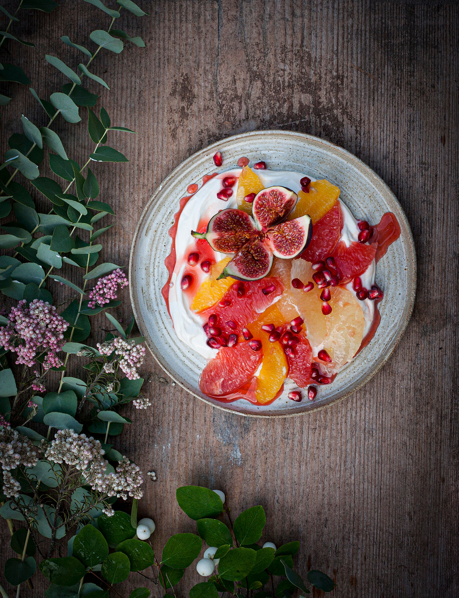- Lägg upp yoghurten på ett fat. Toppa med citrus, fikon, granatäppelkärnor och ringla över fruktsirapen.