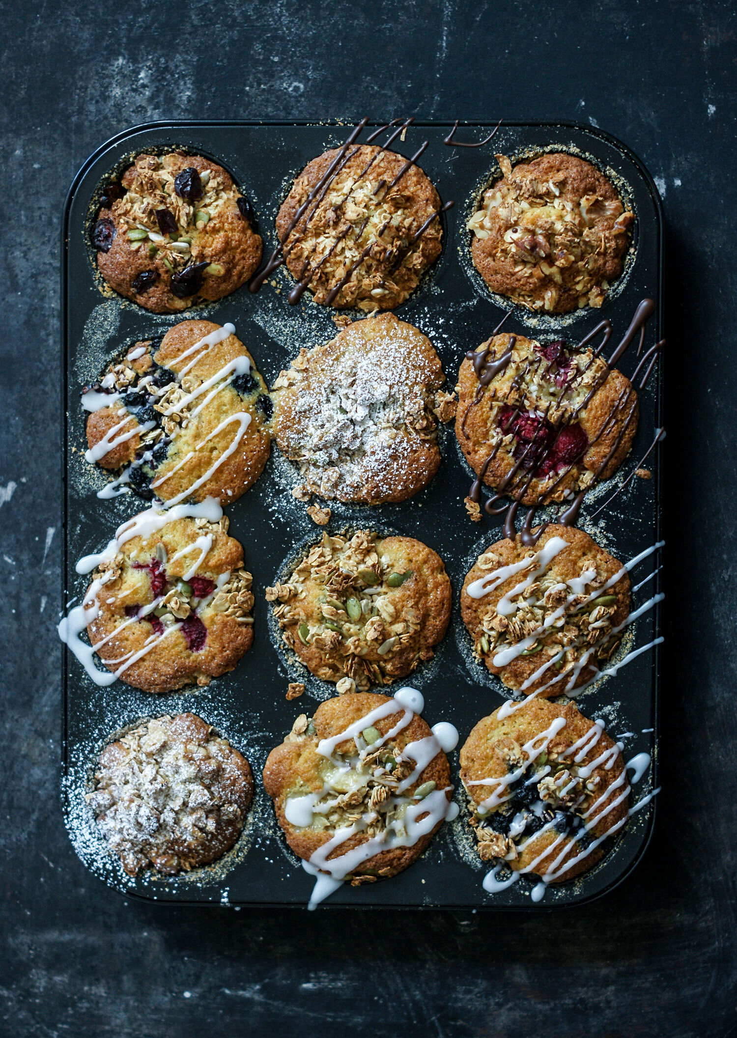 - Fyll formarna med smet tills de är 3/4 fulla. Strö över crumble. (Se förslag på ytterligare smaksättningar nedan.) Grädda i 15 – 20 minuter eller tills en sticka kommer ut torr. Håll koll så att de inte bränns. Lägg på lite folie ifall de börjar få för mycket färg. Låt svalna.
