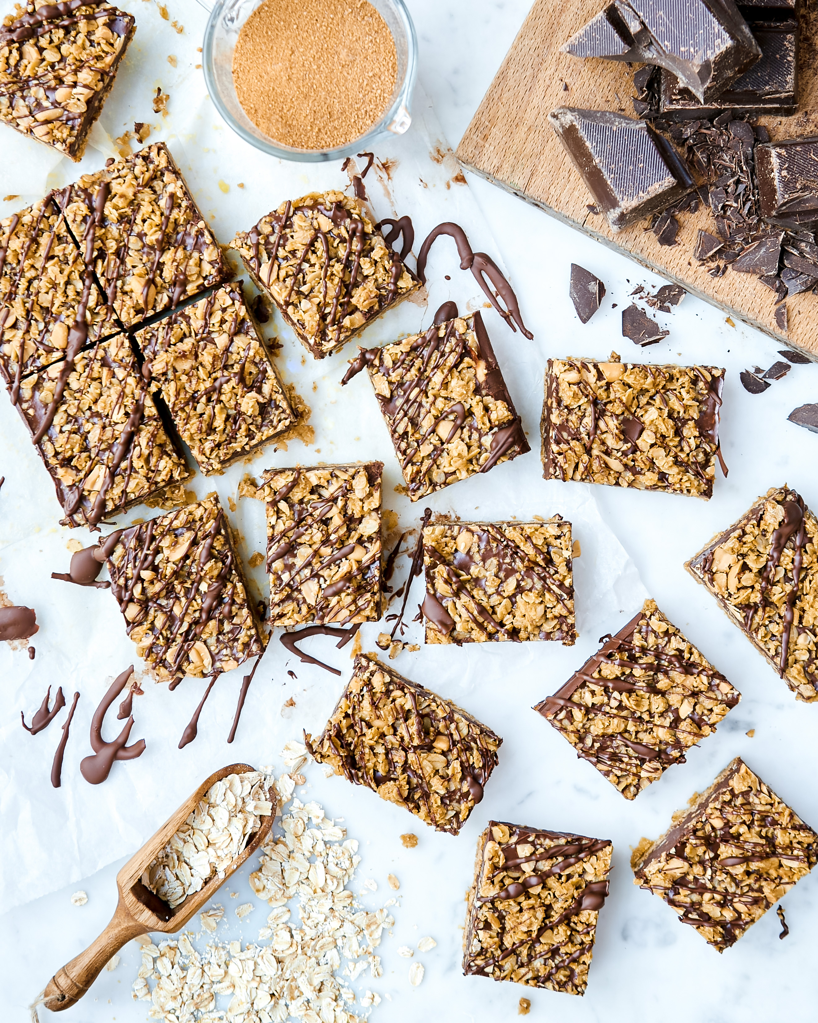 - Smält chokladen och ringla över. Låt stelna och skär i rutor.