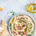 Bönröra med rostad vitlök toppad med pinjenötter och oliver