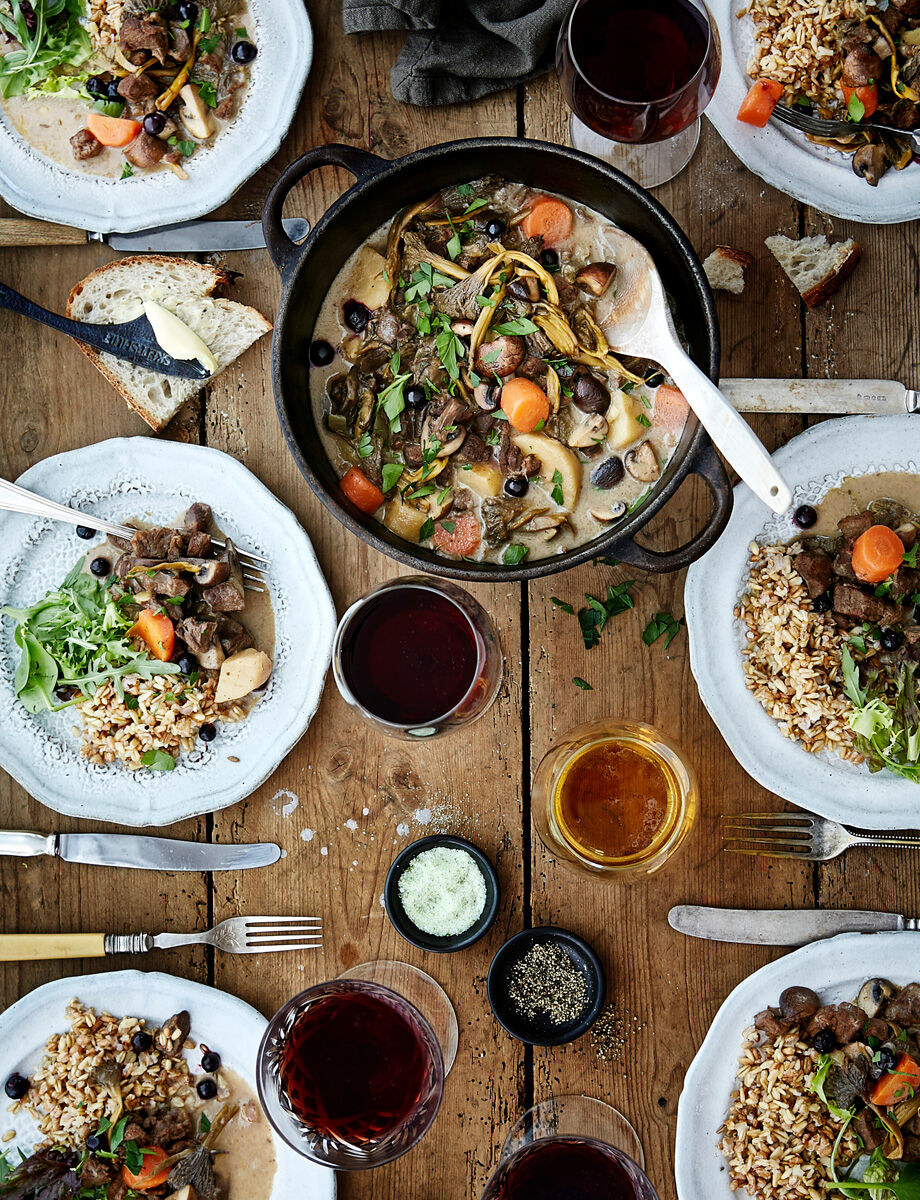 En underbar viltgryta med messmör och svartvinbär. Grytan kan serveras med t ex potatispuré, råris eller kvarngryn såsom vi har serverat här. Kvarngryn är en blandning av havre, vete och råg.