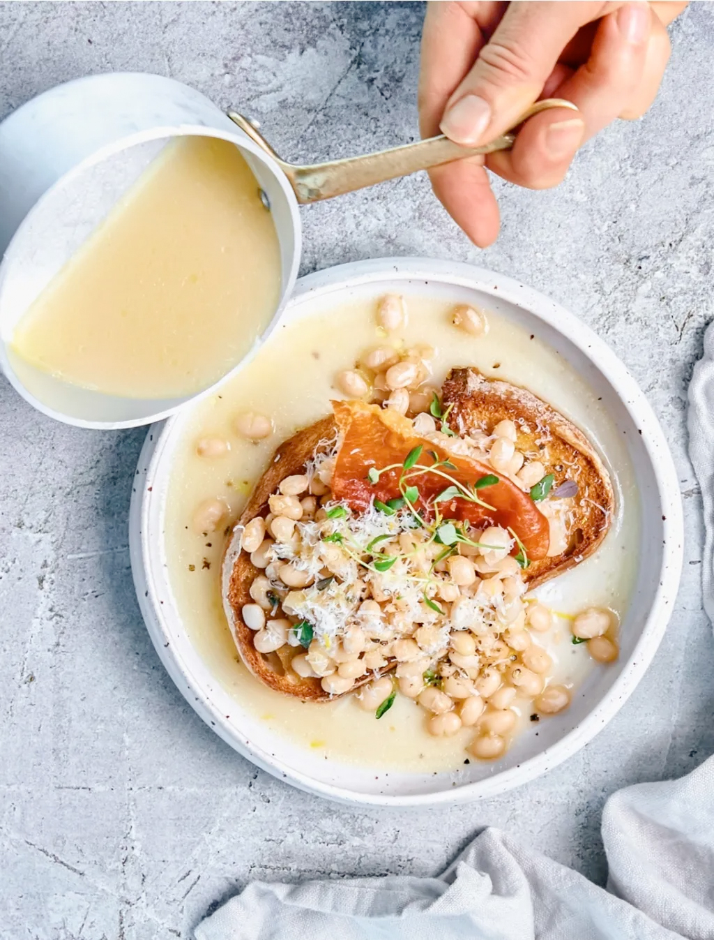 - Lägg upp brödskivorna i djupa tallrikar. Toppa med bönorna. Riv över parmesan. Toppa med ett prosciuttochips, timjan, svartpeppar och lite rivet citronskal. Häll upp lite buljong i varje tallrik och servera direkt.