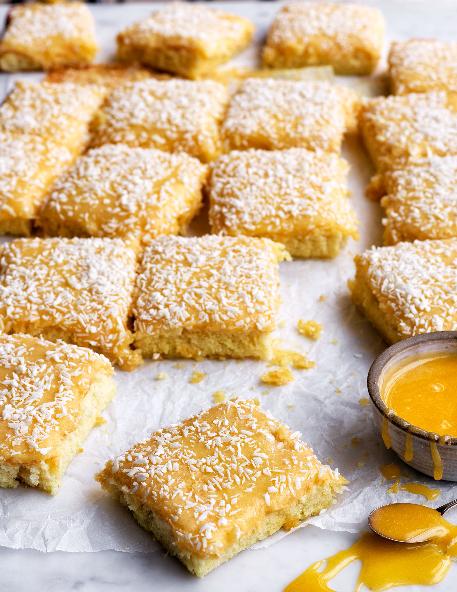 - Bred ut glasyren jämt över kakan och strö över kokosflingor.