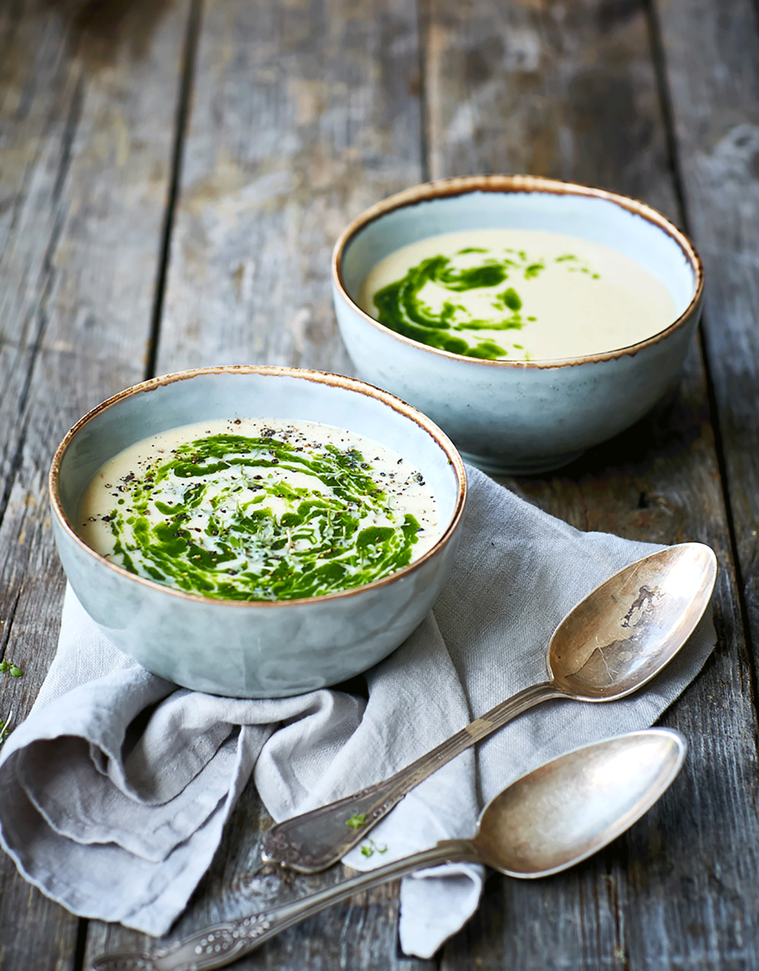 7. Fördela soppan i kylda glas eller skålar. Ringla över ramslöksoljan och strö över nymalen svartpeppar.