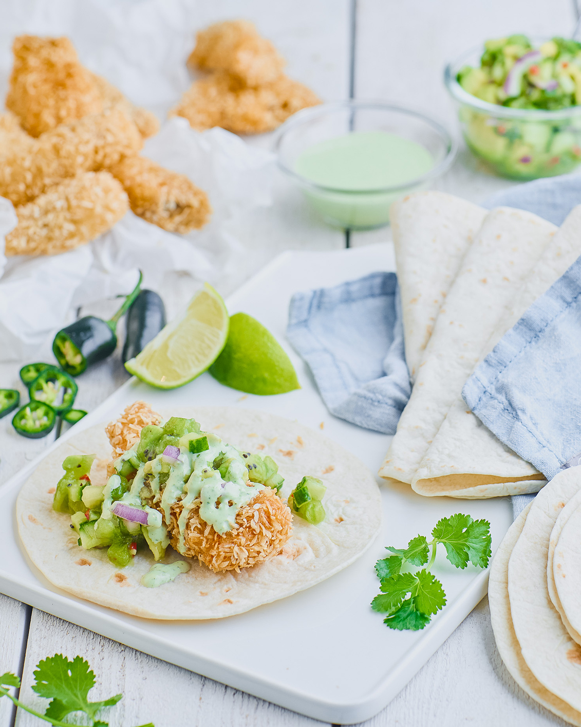 - Servera fisken med tortillabröd, salsa och korianderdressing.