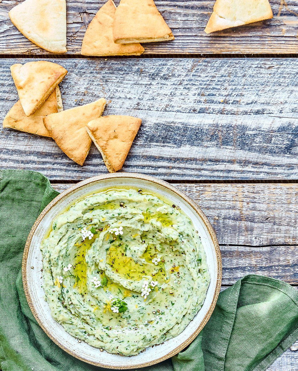 - Lägg röran på ett fat. Ringla över olja och garnera med löktravsblommor. Servera röran med pitachipsen.