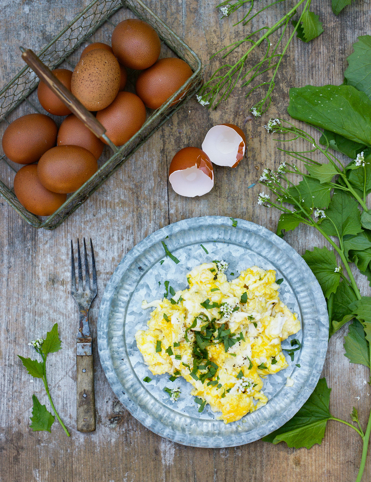 En enkel och smakrik äggröra med löktrav som ger en lätt smak av lök. Här toppar vi med löktrav på slutet då den kommer bäst till sin rätt när den inte värms upp.Tips! Plocka inte löktrav vid vägkant och se till att alltid skölja först.