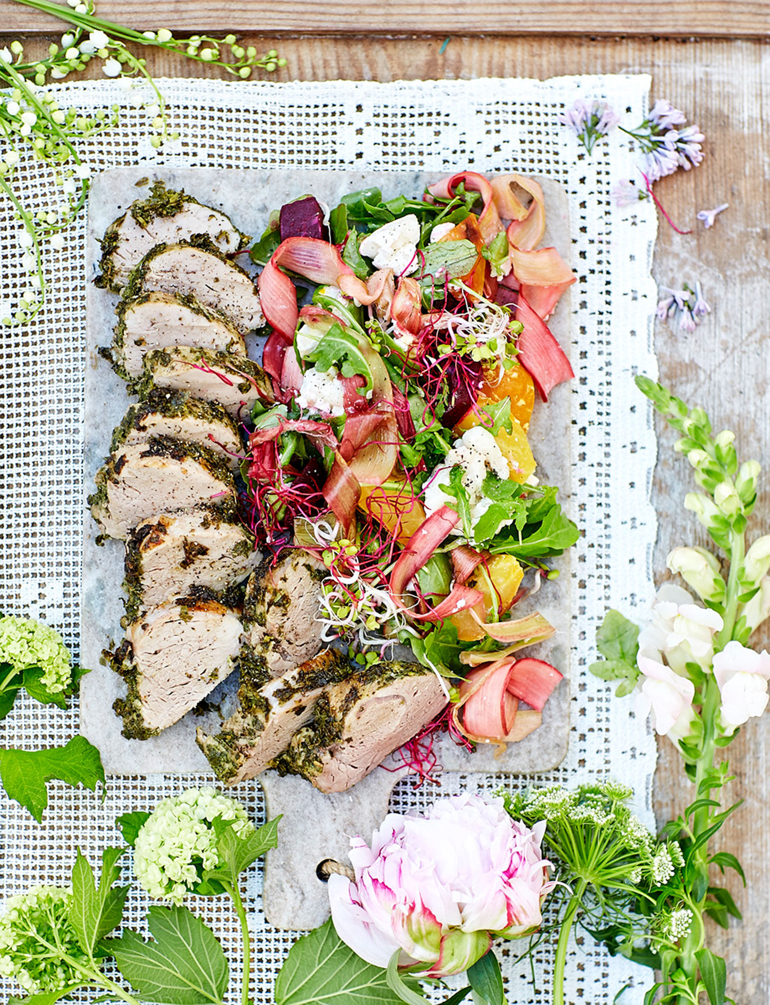 En härlig sommarmiddag med örtmarinerad fläskfilé samt en sallad på rabarber, rucola, betor och chèvre.Foto: Lisa Björner