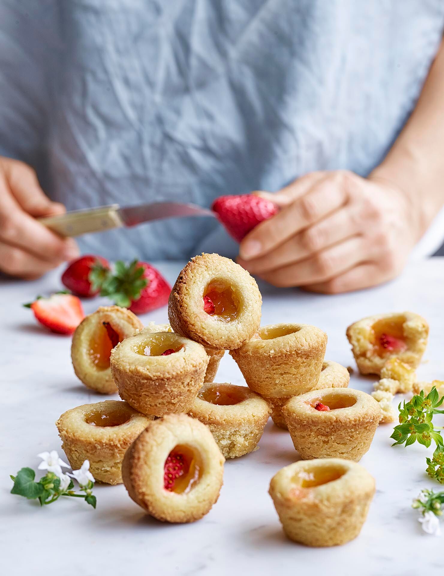 - Skär jordgubbarna i små klyftor och tryck ner en klyfta i lemon curden.