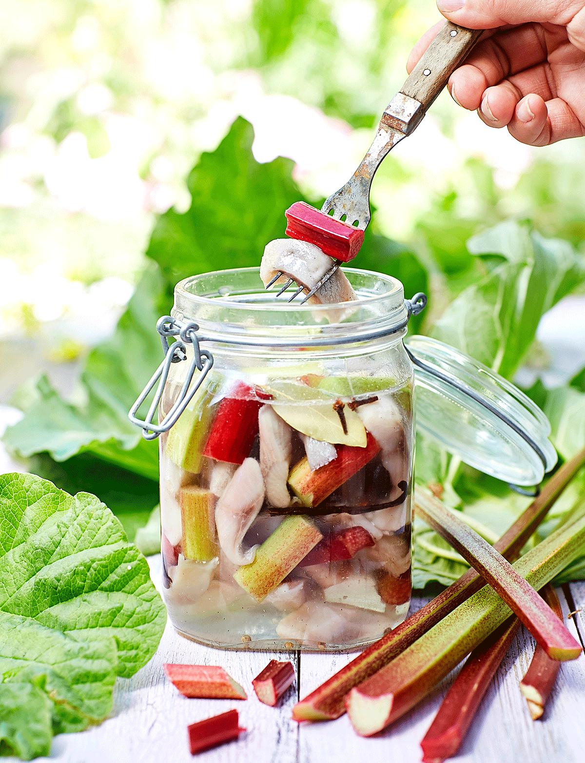 4. Koka upp lagen, ta av från värmen och lägg i rabarbern. Låt lagen sedan kallna och slå den över sillen