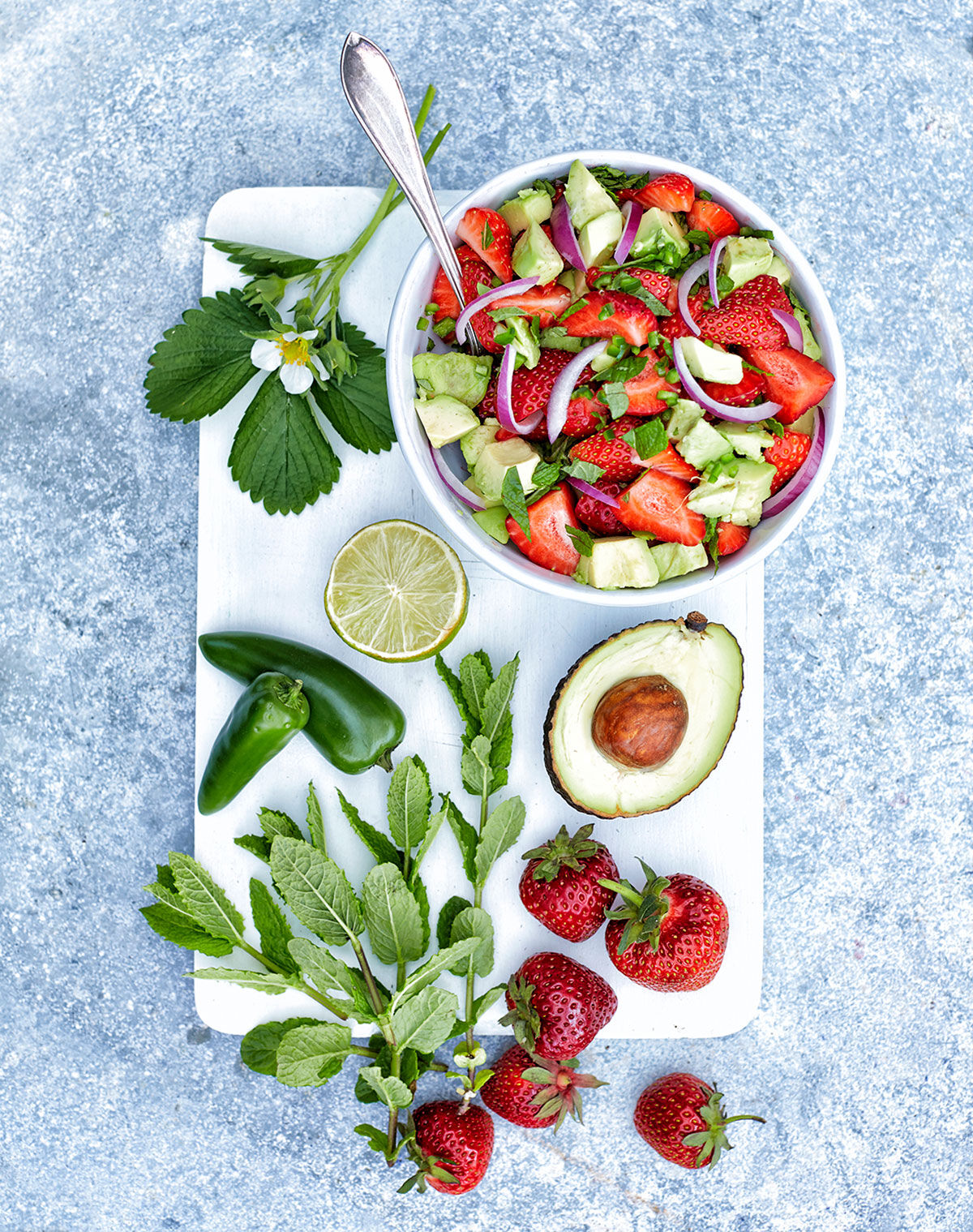 - Ansa och skär jordgubbarna i bitar. Finhacka jalapenon. Kärna ur och tärna avokado.